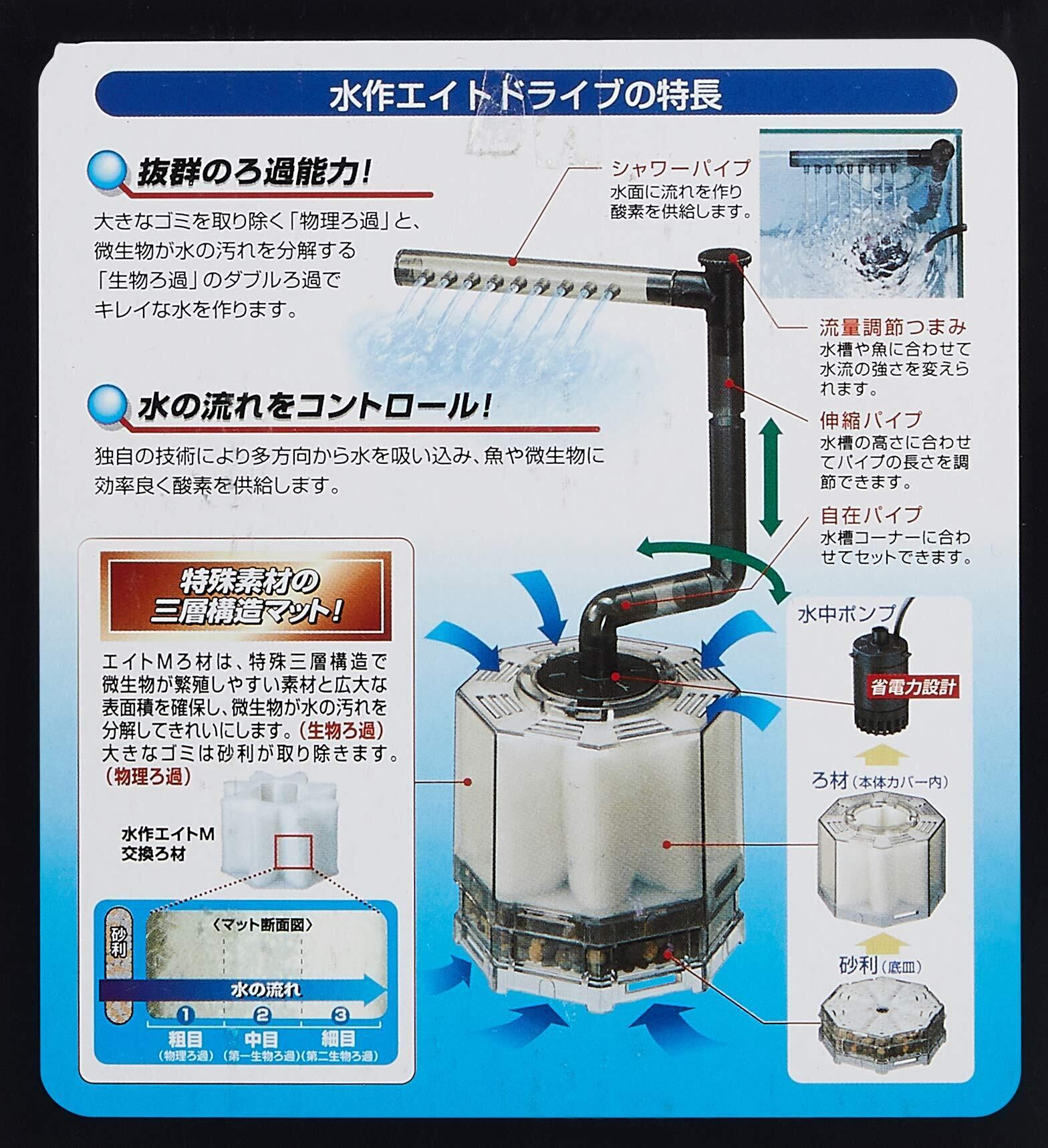 水作エイトの優れたろ過能力はそのままに高性能水中ポンプを組み込み、静音性を実現しました。CO2を逃がさない為、水草水槽にも使用可能です。大きなゴミを取り除く「物理ろ過」と、微生物が水の汚れを分解する「生物ろ過」のダブルろ過できれいな水をつくります。独自の技術により他方向から水を吸い込み、魚や微生物に効率よく酸素を供給します。自在パイプ・伸縮パイプ・流量調節つまみ・シャワーパイプにより水の流れをコントロールできます。
