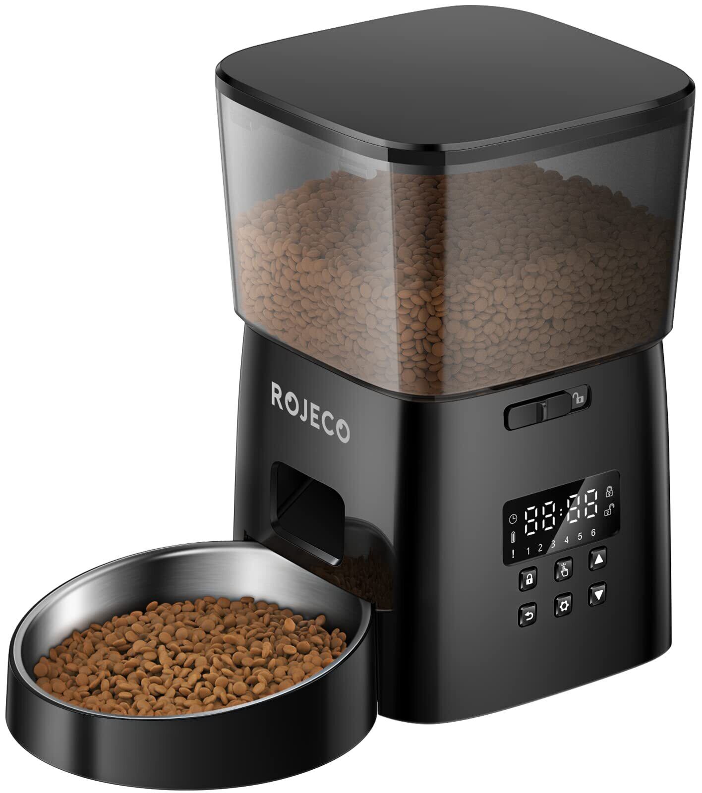 ROJECO タイマー式 自動給餌器 猫 餌詰まり防止 透明タンク 多頭飼いに向け 自動餌やり器 2L容量 1日6食 じどうえさやり 2WAY給電 手動給餌可 日本語説明書付き
