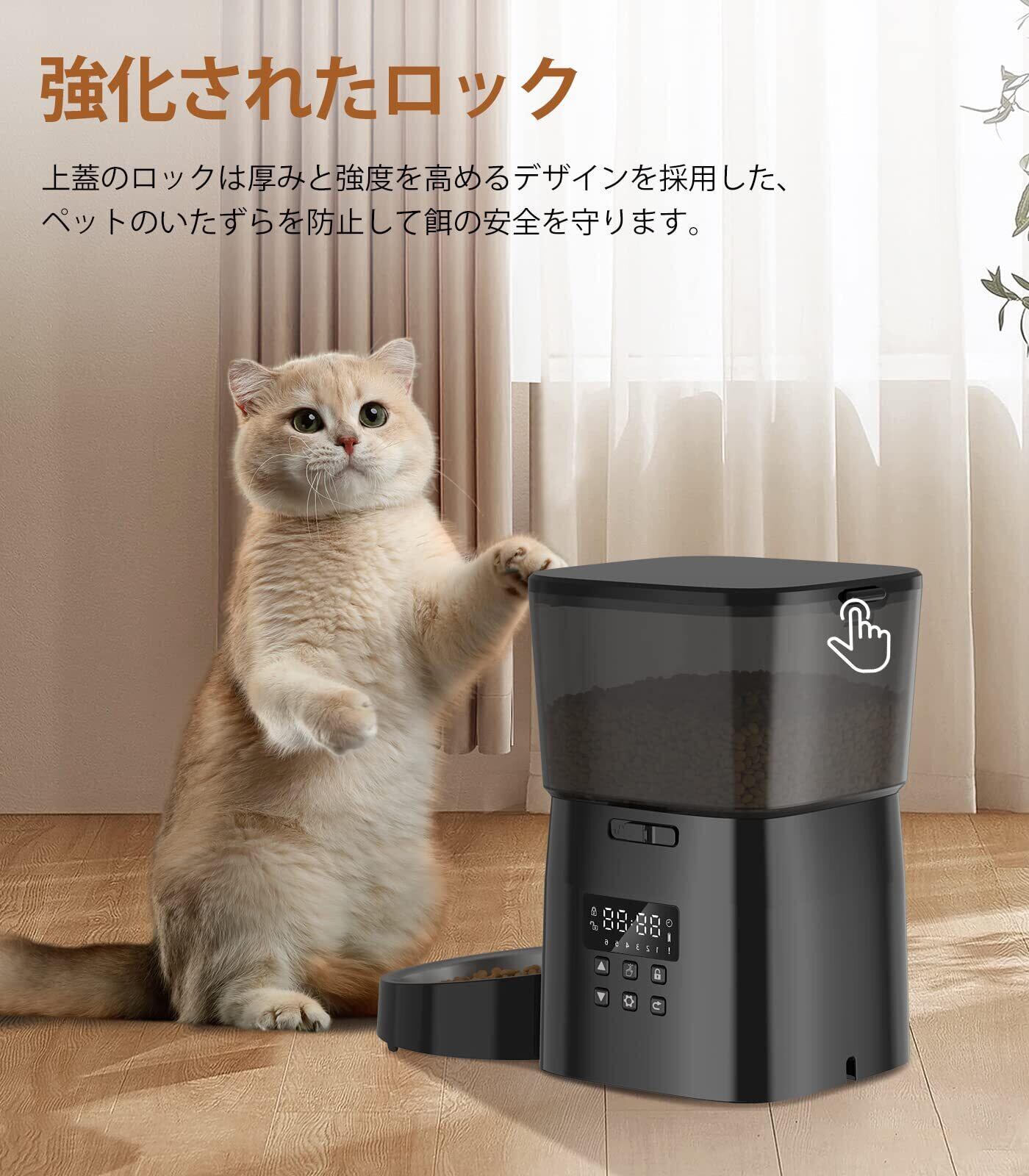【二重ロック保護】:ボタンパネルのロックだけでなく、上蓋にもロックが付きる。ペットのいたずらを防止して餌の安全を守る。ご注意:給餌設定する前に、まずインジゲーター画面のロックを解除してください。