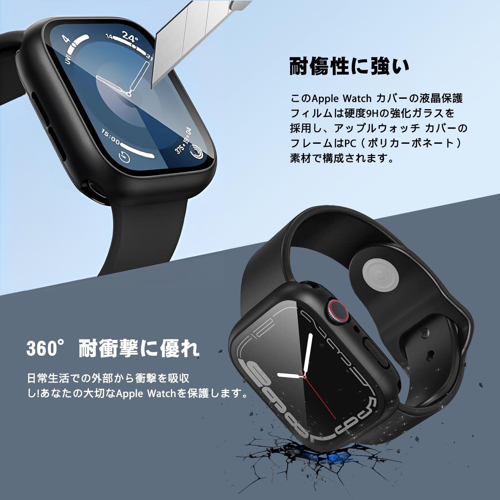 【全面保護・衝撃に強い】このApple Watch カバーの液晶保護フィルムは硬度9Hの強化ガラスを採用し、Apple WatchカバーのフレームはPC(ポリカーボネート)素材で構成されます。耐傷性、耐衝撃性に優れアップルウォッチへの落下や傷など不測の事態の損傷を最小限に抑えてます。