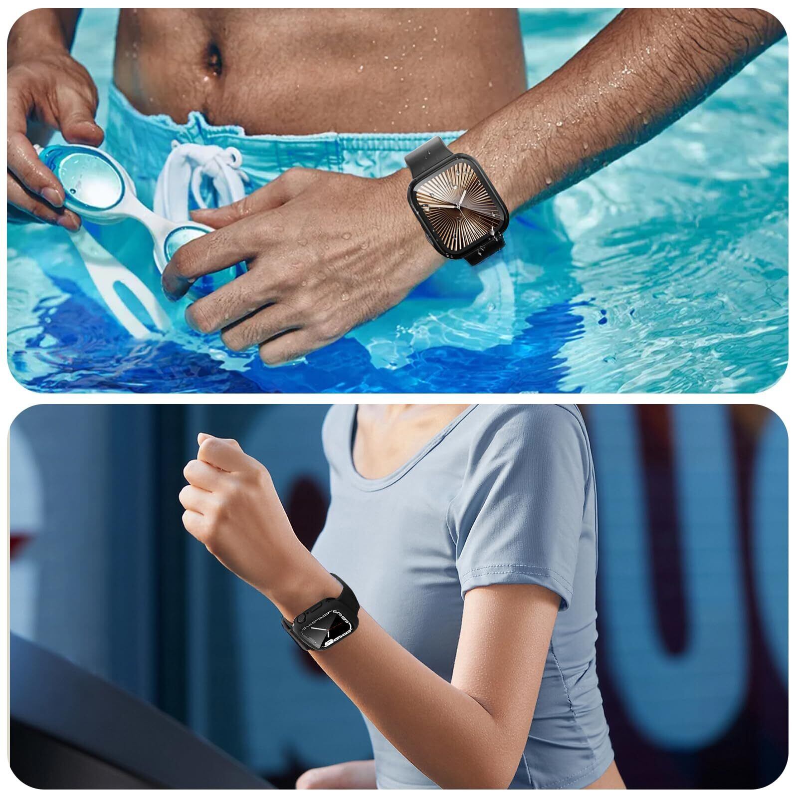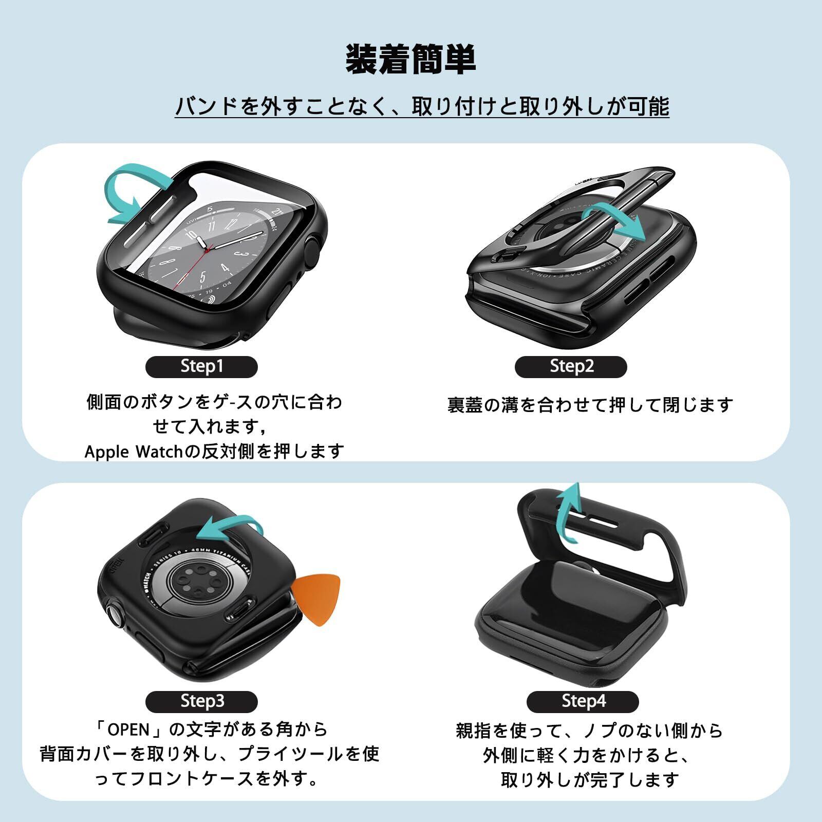 【2IN1防水・防塵ケース】シーリングリング内蔵したアッApple Watch ケース、アップルウォッチの画面にぴったりとフィットし、アップルウォッチ前面カバーと背面カバーの2 in 1全周保護設計で,表面から裏面まで 360度の全面保護します、IP67防水、防塵設計。ケースを取り外して水を拭くすることを繰り返す必要はありません。疎水性撥油性抜群の強化ガラス表面により、カバー面に水が溜まらず、シャワー、手洗い、発汗、運動、雨など、日常の使用に適しています。 ※ご注意:ウォッチの画面とカバーの間に水が浸入する場合、保護カバーを取り外し、柔らかい布で水を乾かしてください。
