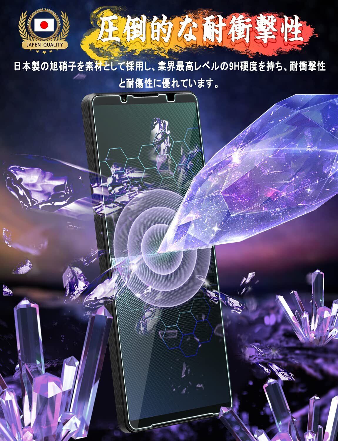 【最高硬度9H·飛散防止】日本旭硝子素材を採用、業界最高レベルの9H硬度、ハードコーティング技術により、衝撃を緩和し画面の破損を最低限まで抑え、すり傷や指紋からもスクリーンをしっかりと保護します。万が一非常に強い力や落下等の衝撃により破損する場合が御座いましたら、その際、高品質な抗粉砕フィルムコーティングの飛散防止加工を施しているため、破損時も破片の飛び散りを抑えます。