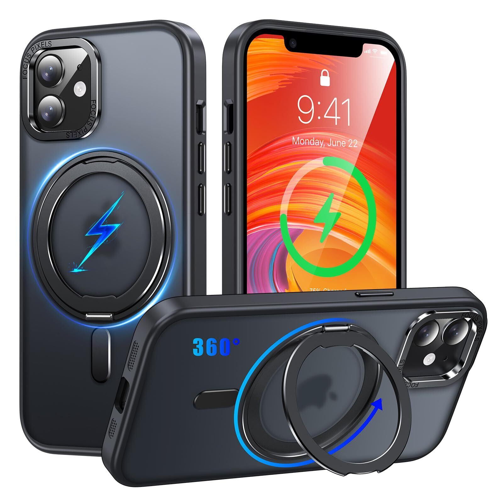 iPhone 11 適用 ケース Magsafe対応 アイフォン11 カバー 360°回転スタンド Uovon スマホケース アイホン 11 携帯ケース ワイヤレス充電 車載ホルダー 対応 ストラップ穴付き 半透明 指紋防止 黄变防止 ・ ブラック
