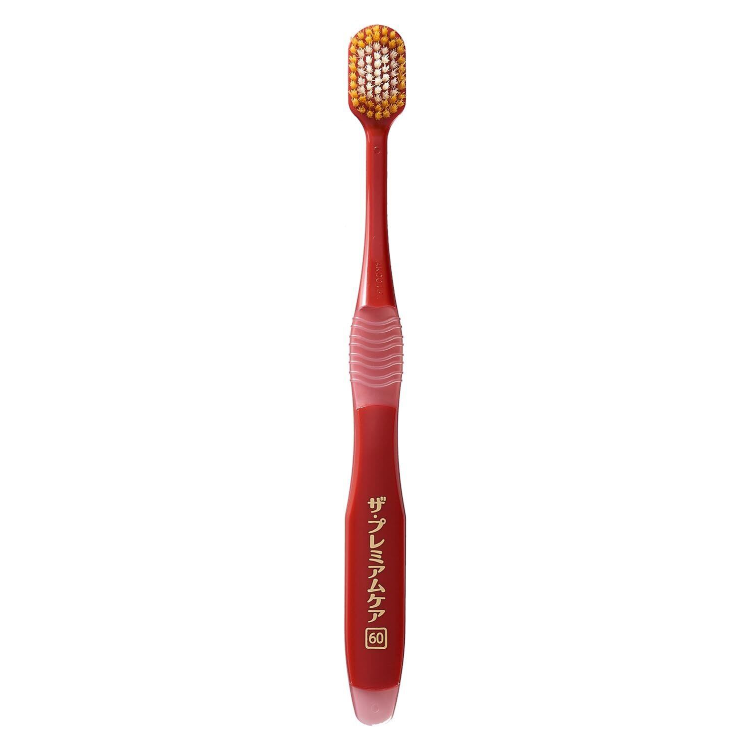 幅広ヘッドハブラシの頂点へ「ザ・プレミアムケアハブラシ」。薄型ヘッドで磨き残しの多い奥歯まで毛先が届く。当社従来品より毛束を密集させた超ぎっしりブラシ。濃密幅広ヘッドが、なめらかな磨き心地で歯と歯ぐきをやさしく包み込んでしっかり磨きあげる。歯ぐきにやさしいソフト毛、歯面をしっかり磨くミディアム毛、歯の凹凸の汚れを落とすハード毛の3種類の毛のかたさ。また、毛先φ0.01mmの超先細毛が磨きにくい歯周ポケットに入り込んで歯垢をかき出し、フラット毛が歯面の歯垢をしっかり落とす。更なる極上の磨き心地へ。効率よく磨ける7列レギュラーヘッド。■毛のかたさ:特にやわらかめ■型番:B-8011SS■インフォメーションタグ:60■毛の材質:飽和ポリエステル樹脂■柄の材質 本体部:ポリプロピレン ラバー部:熱可塑性エラストマー■耐熱温度:80℃■日本製■個装サイズ 38×230×19mm 22g