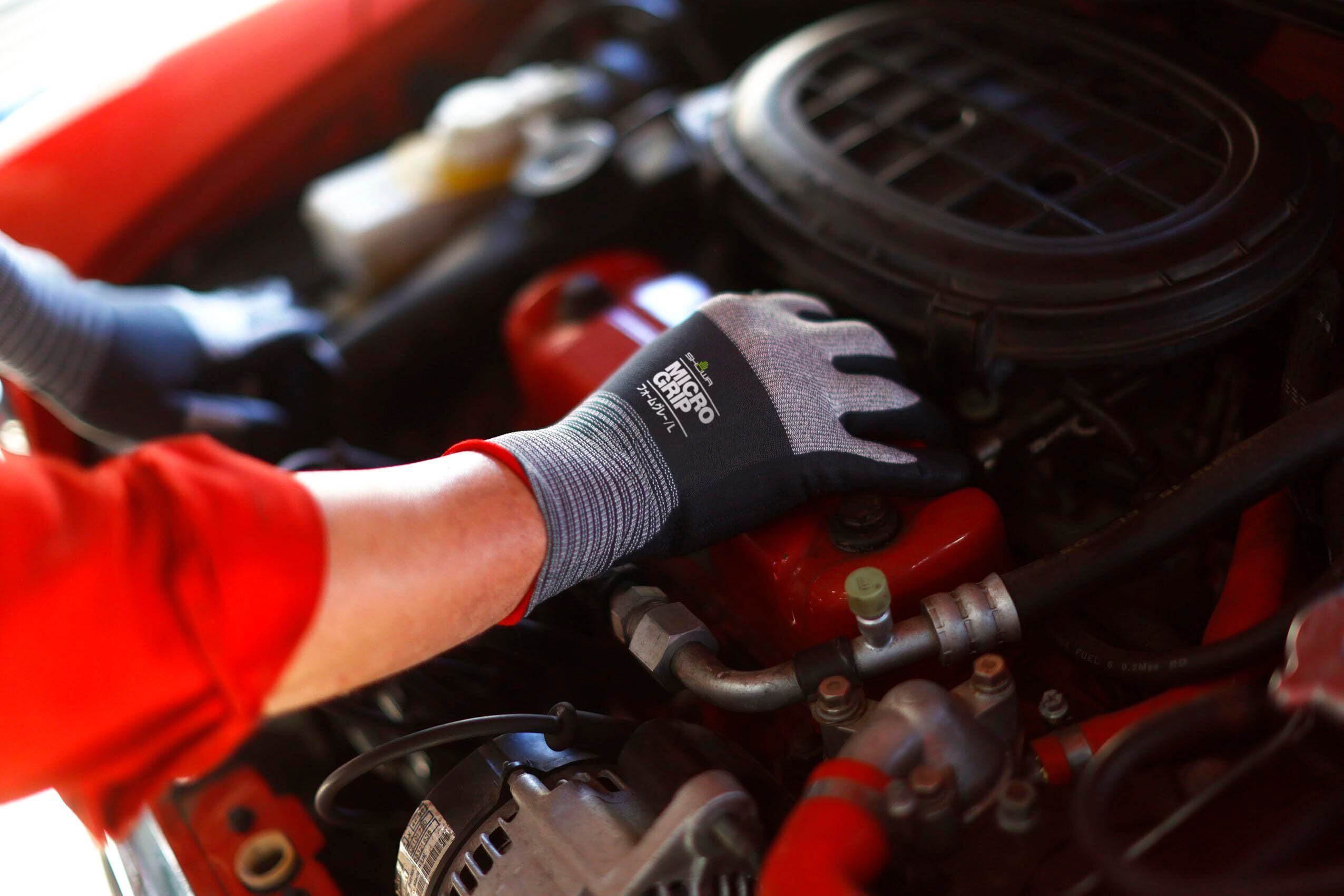 ● マイクロファイバーの編み目を密にすることで肌への密着性を高め、手袋内面のスベリ止め効果を高めています。