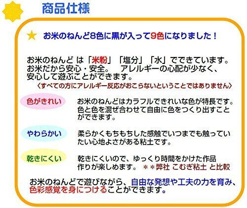 ●内容物:お米のねんど30g×9色(赤・黄色・緑・青・ピンク・オレンジ・茶色・黒・白)