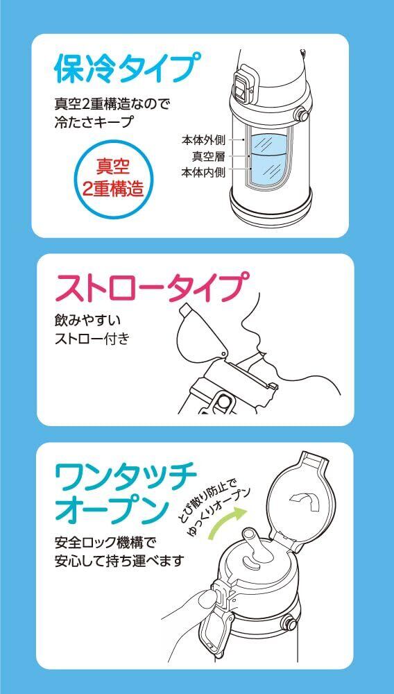 ●保冷専用のストロー付きステンレスボトル。●フタはプッシュボタン式でワンタッチオープン。