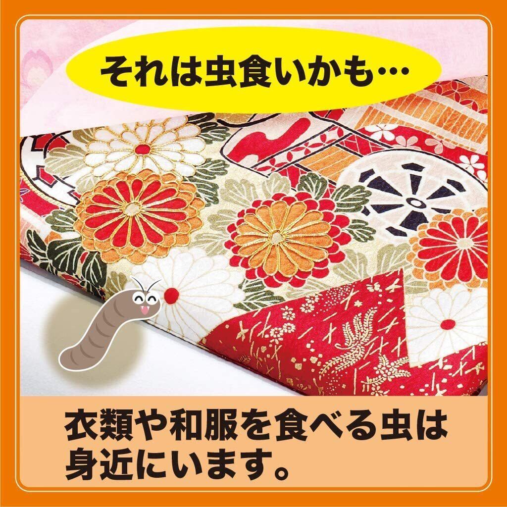 <有効期間1年> 1年間大切な和服を虫から守ります。 <和服にニオイがつきません> 防虫剤のニオイが和服に移りませんので、取り出してすぐ着られます。 <シート全面で防虫> 薄手のシート全面で、一着ずつ大切な和服を守ります。 <金糸、銀糸にも安心> 金糸、銀糸、ラメ加工製品にもご使用いただけます。 <防カビ剤配合でカビの発育を抑えます> <お取り替えシール付き> お取り替え時期がわかります。 ●他のせんい製品防虫剤と一緒に使用しても差しつかえありません。 【使用方法】 <衣類の収納前に> ※虫害やカビの原因となるので、下記のことをご確認ください。 ●衣類の汚れをきちんと落としてください。 ●衣類はしっかり乾燥させてください。 ●クリーニングのカバーなどは外して収納してください。 袋から取り出し、容器のフック右側のベロを引き抜いてから、ウォークインクローゼットのパイプに等間隔で吊り下げてください。 1引き抜く 2パイプに吊り下げる 【保存方法】 温度が低く、直射日光の当たらない場所に密封したまま保存すること。 【標準使用量】 2畳までのウォークインクローゼットに3個 180×240×180(単位:cm) <衣替えアドバイス> ●汚れた衣類は虫の被害や、カビ発生の原因になります。汚れをよく落として収納しましょう。 ●衣類を収納する時は、本品と除湿剤(ドライペット)を一緒に使用すると、防虫・防カビ・除湿の効果で、大切な衣類を守ります。