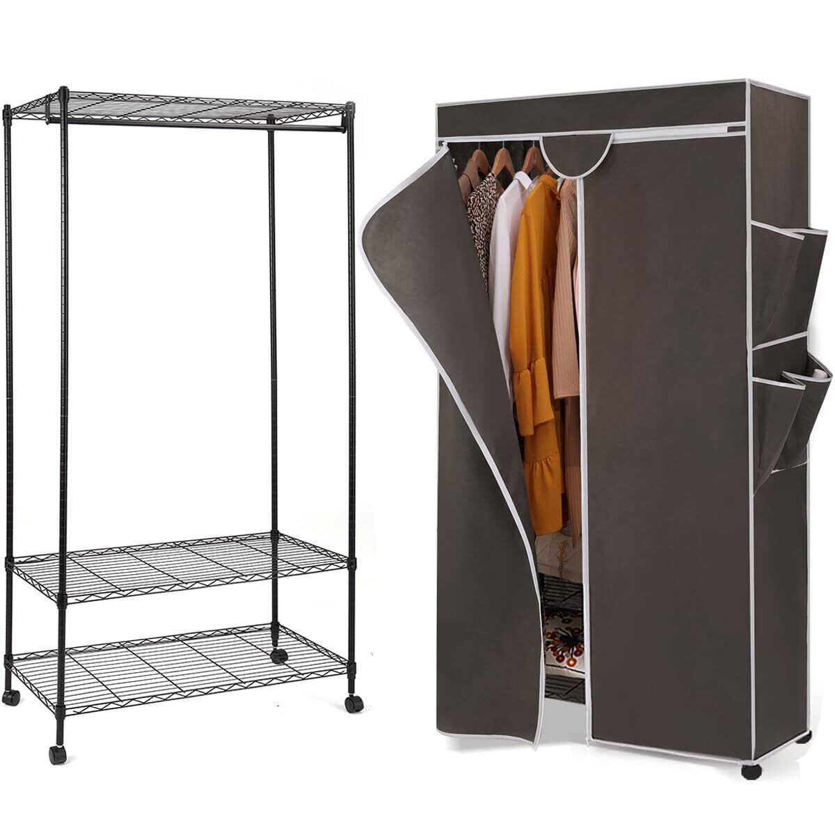 AZAKBL ハンガーラック幅92×奥行46×高さ173cm ワードローブ クローゼット カバー付き キャスター付 スチールラック メタル スリム 省スペース おしゃれ 頑丈 ハンガーかけ コートハンガー 洋服収納 (グレー)