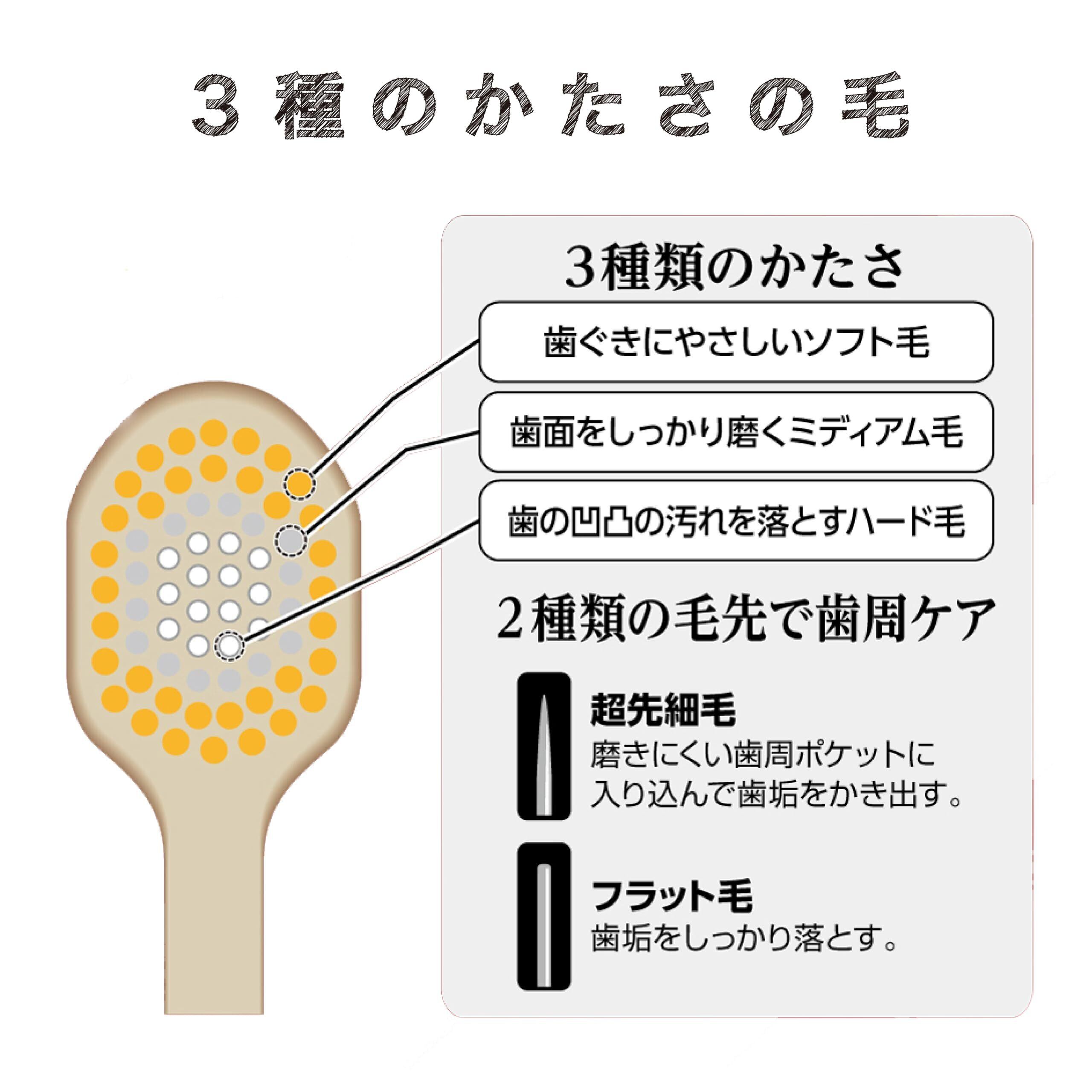 幅広ヘッドハブラシの頂点へ「ザ・プレミアムケアシリーズ」から歯ぐきやせによる、すき間汚れを落とす「ザ・プレミアムケアすき間プラス」が発売。中央部の長い毛が歯ぐきやせによる、すき間につまった汚れを除去。毛束を密集させた超ぎっしりブラシ。なめらかな磨き心地で、歯と歯ぐきをやさしく包み込んでしっかり磨きあげる。歯ぐきにやさしいソフト毛、歯面をしっかり磨くミディアム毛、歯の凹凸の汚れを落とすハード毛の3種類の毛のかたさ。また、毛先Φ0.01mmの超先細毛が磨きにくい歯周ポケットに入り込んで歯垢をかき出し、フラット毛が歯面の歯垢をしっかり落とす。薄型ヘッドで磨き残しの多い奥歯まで毛先が届く。更なる極上の磨き心地へ。■毛のかたさ:ふつう■型番:B-8017M■インフォメーションタグ:T62■毛の材質:飽和ポリエステル樹脂■柄の材質 本体部:ポリプロピレン ラバー部:熱可塑性エラストマー■耐熱温度:80℃■日本製■個装サイズ 38×230×20mm 22g