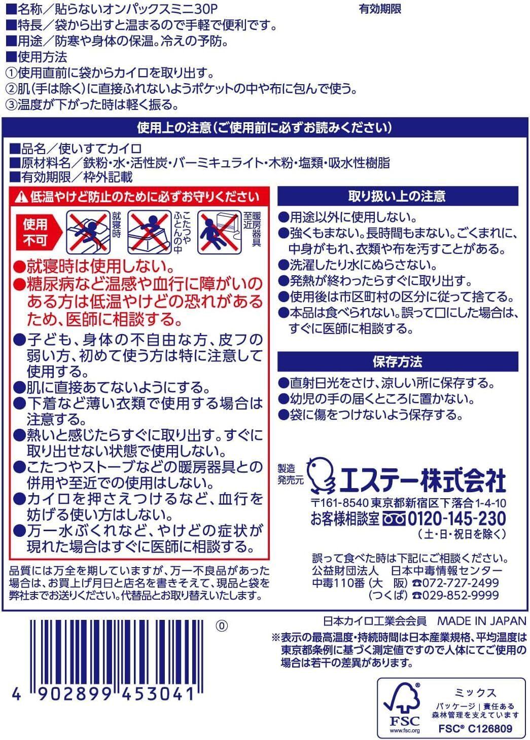 オンパックス 貼らない 貼らないカイロ ミニ 30個入 【日本製/持続時間約10時間】 貼らない R