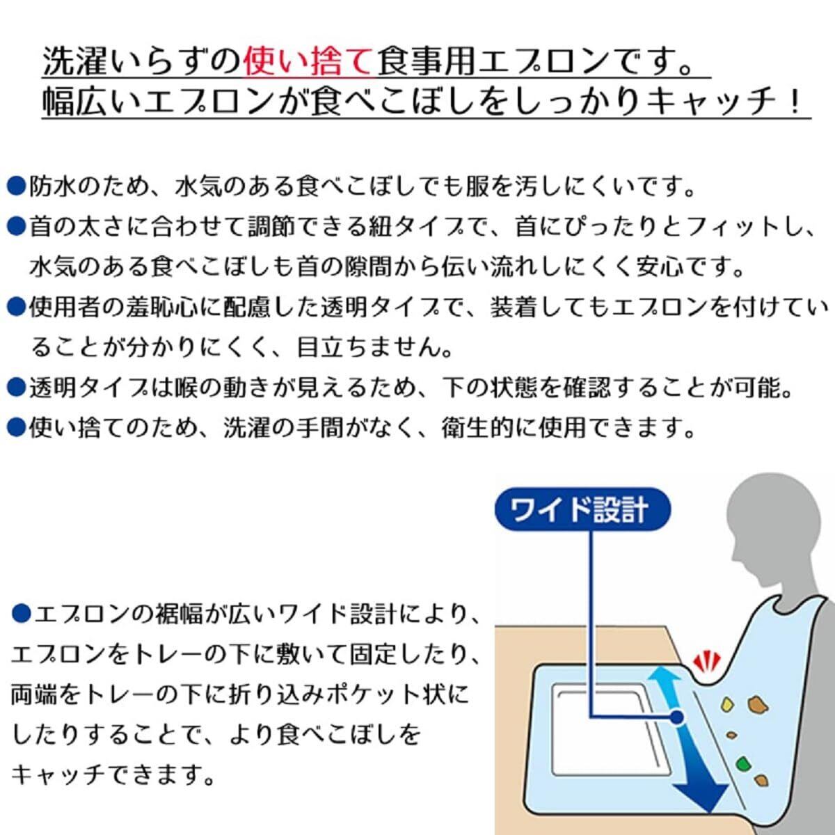 "洗濯いらずの使い捨て食事用エプロンです。 幅広いエプロンが食べこぼしをしっかりキャッチ!