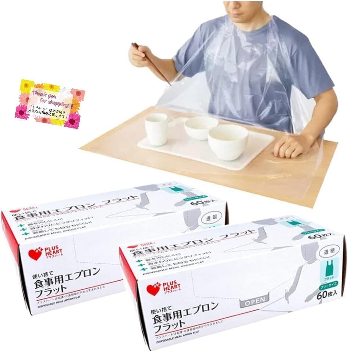 日本製 プラスハート 使い捨て 食事用エプロン フラット透明 フリーサイズ 60枚入 完全防水 ワイド設計 しっかりキャッチ ぴったりとフィット 洗濯不要【2個セット】