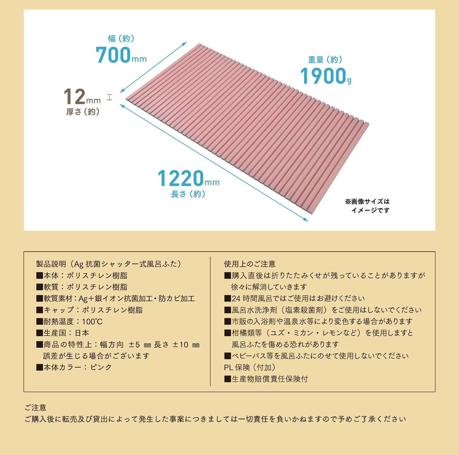 色:ピンク | サイズ:70×122cm■使い始めに素材特有のにおいがする場合がありますが、気になる場合は陰干しなど日陰に放置しにおいが消えてからご使用ください ■風呂ふたを洗う時には中性の浴槽洗剤をご使用ください■汚れ落としに塗料用のシンナー、塩素系の洗剤、漂白剤、カビ取り剤、および歯磨き粉、固いたわし等は、風呂ふたを傷めますので絶対にし使用しないでください■いつも濡れたままの状態ではカビが発生しやすくなります。ときどき陰干しをしてください■一部の入浴剤や温泉水等により変色する場合がありますのでご注意ください■風呂水洗浄剤(塩素殺菌等)、浴室用洗剤(アルカリ性等)によって風呂ふたが傷んだり、変色、劣化しますので使用しないでください■塩素系殺菌、浴槽水浄化保温装置(24時間風呂)にご使用されますと風呂ふた表面の荒れ、退色などの変化を生じるおそれがありますので、ご使用をお避けください■風呂ふたの上にベビーバスなどを乗せて使用するのは大変危険です絶対にやめましょう