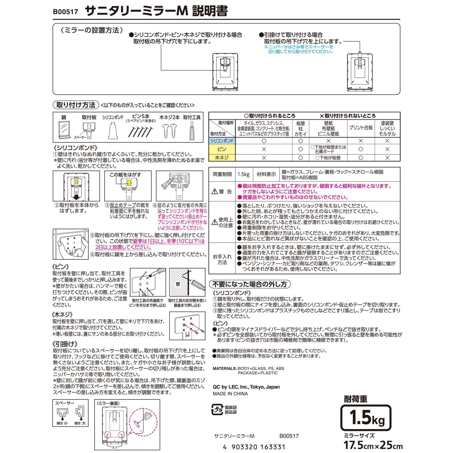 【素材】●鏡:ガラス ●フレーム・裏板・ラック:スチロール樹脂 ●取付板:ABS樹脂