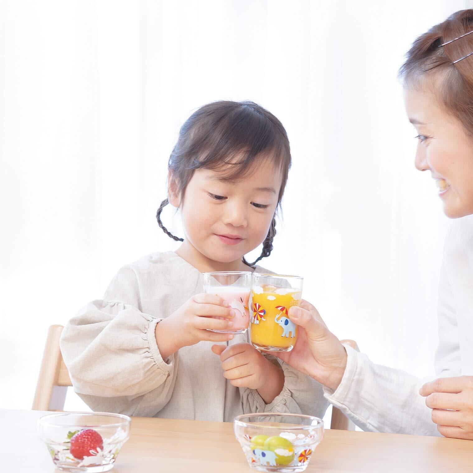〇「パパ・ママの声から生まれたデザイン」特徴はガラスの透明感を活かした、グラスの外側と内側で見え方が違うデザイン。食べ物が入っている状態ではチラリとしか見えない動物が、食べ終わると姿を現します。絵本を読み進めるように、ワクワクしながら食事の時間を楽しんでほしい。そんな想いを込めて、子育て中のパパ・ママの意見やアイディアを取り入れながら開発しました。 〇「日本製で安全・安心」毎日使うものだから、信頼できる日本製を。「つよいこグラス」シリーズは創業200年の歴史を持つ石塚硝子株式会社で製造されています。