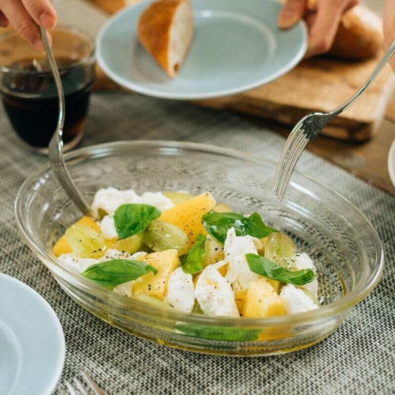 耐熱ガラス製だから、電子レンジ・オーブンで使えてそのまま食卓にも並べられる。