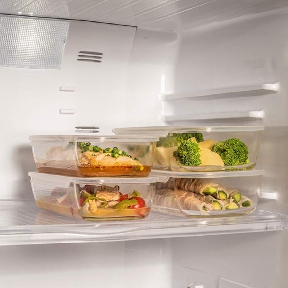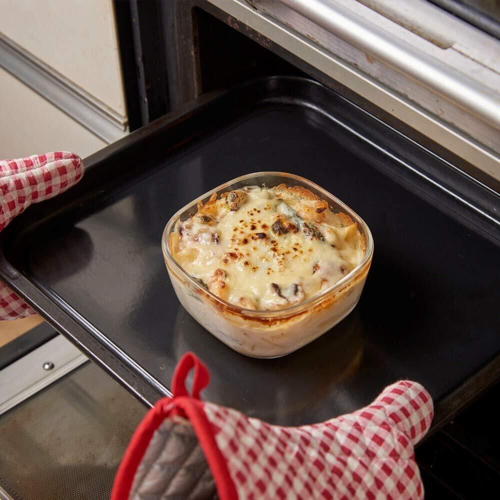 調理してそのまま食卓へ。長方形の保存容器は冷蔵庫の奥行きを活かした省スペース収納。フタをしたまま電子レンジ、フタを外してオーブンOKです。色々な料理の保存・調理に使える6個セットです。