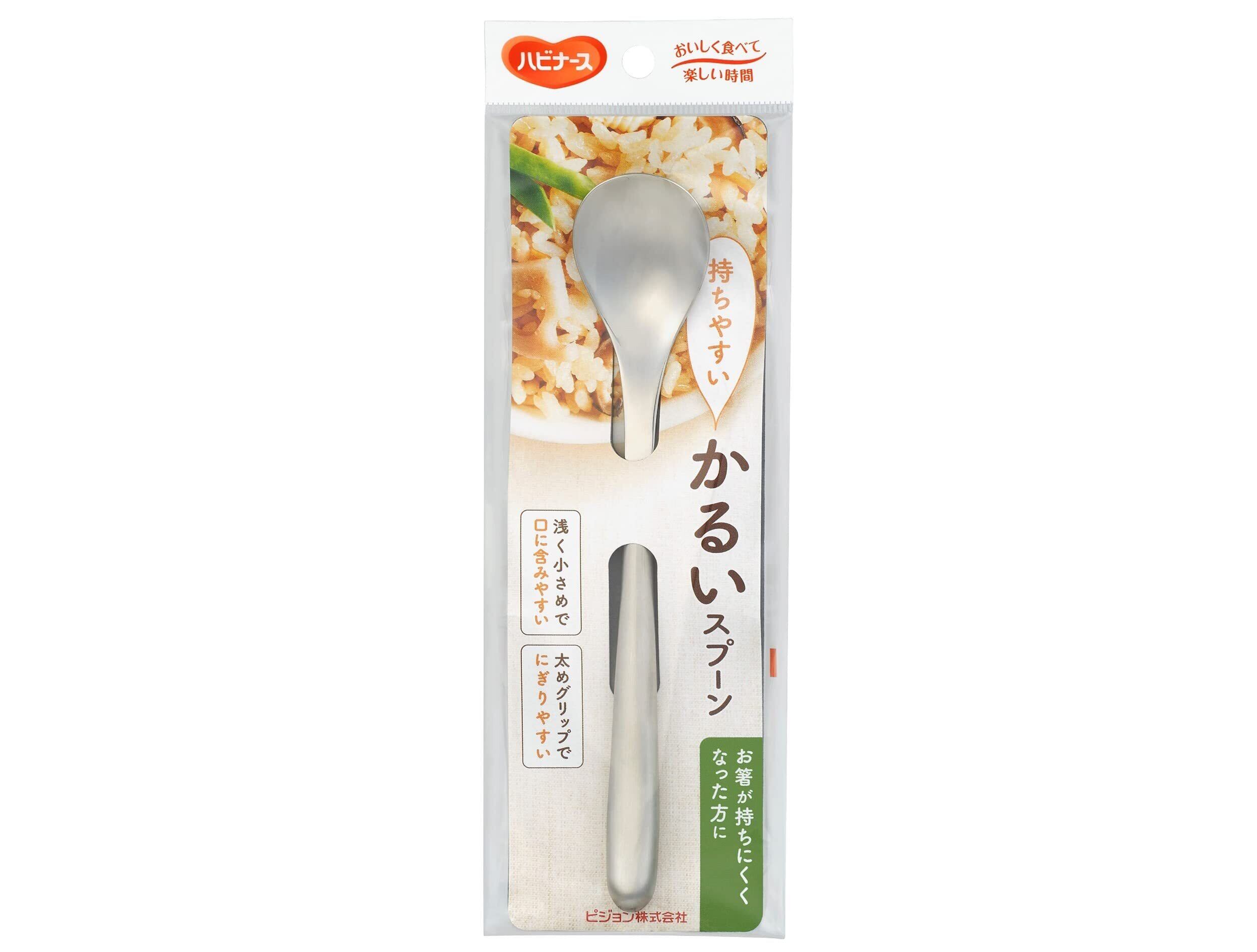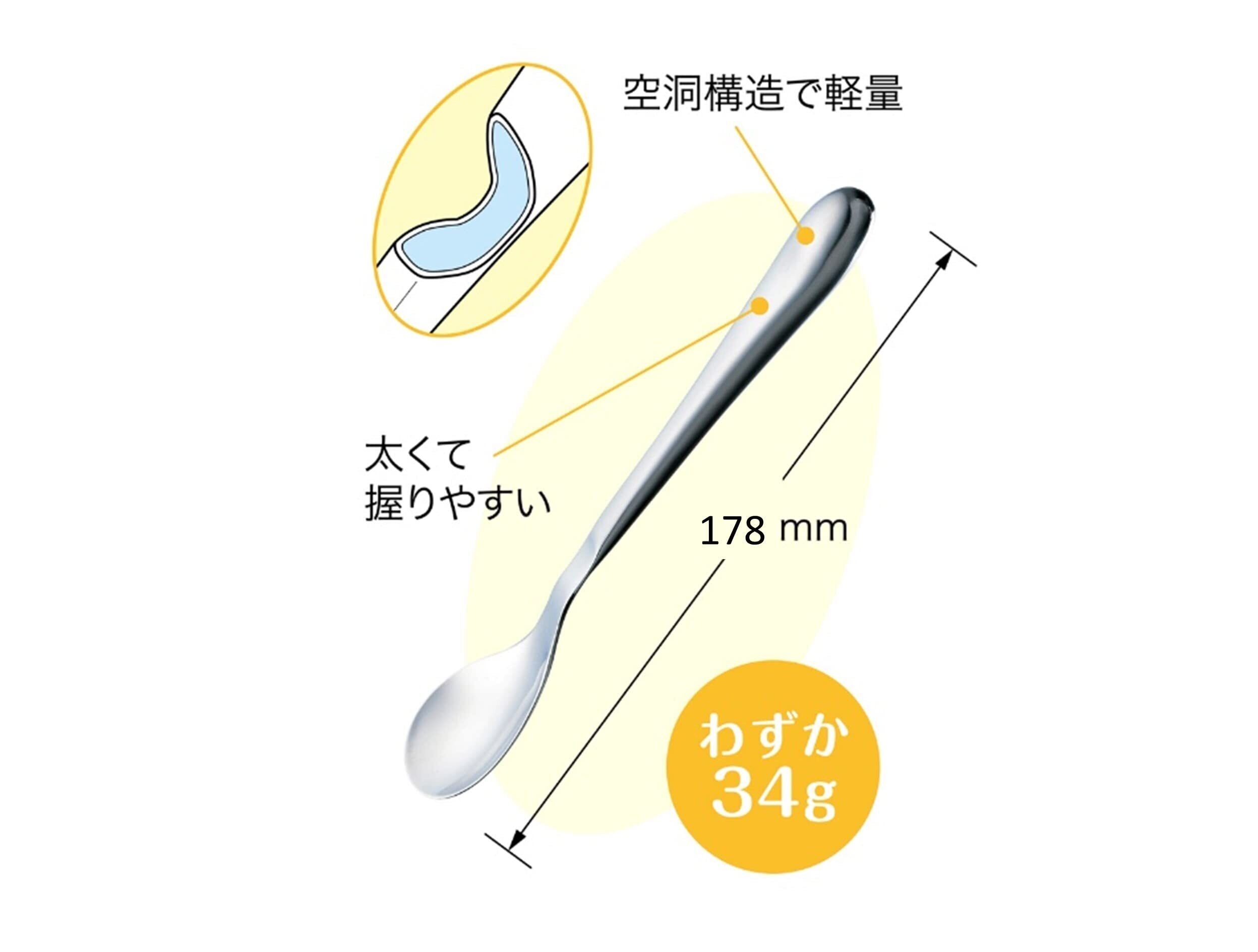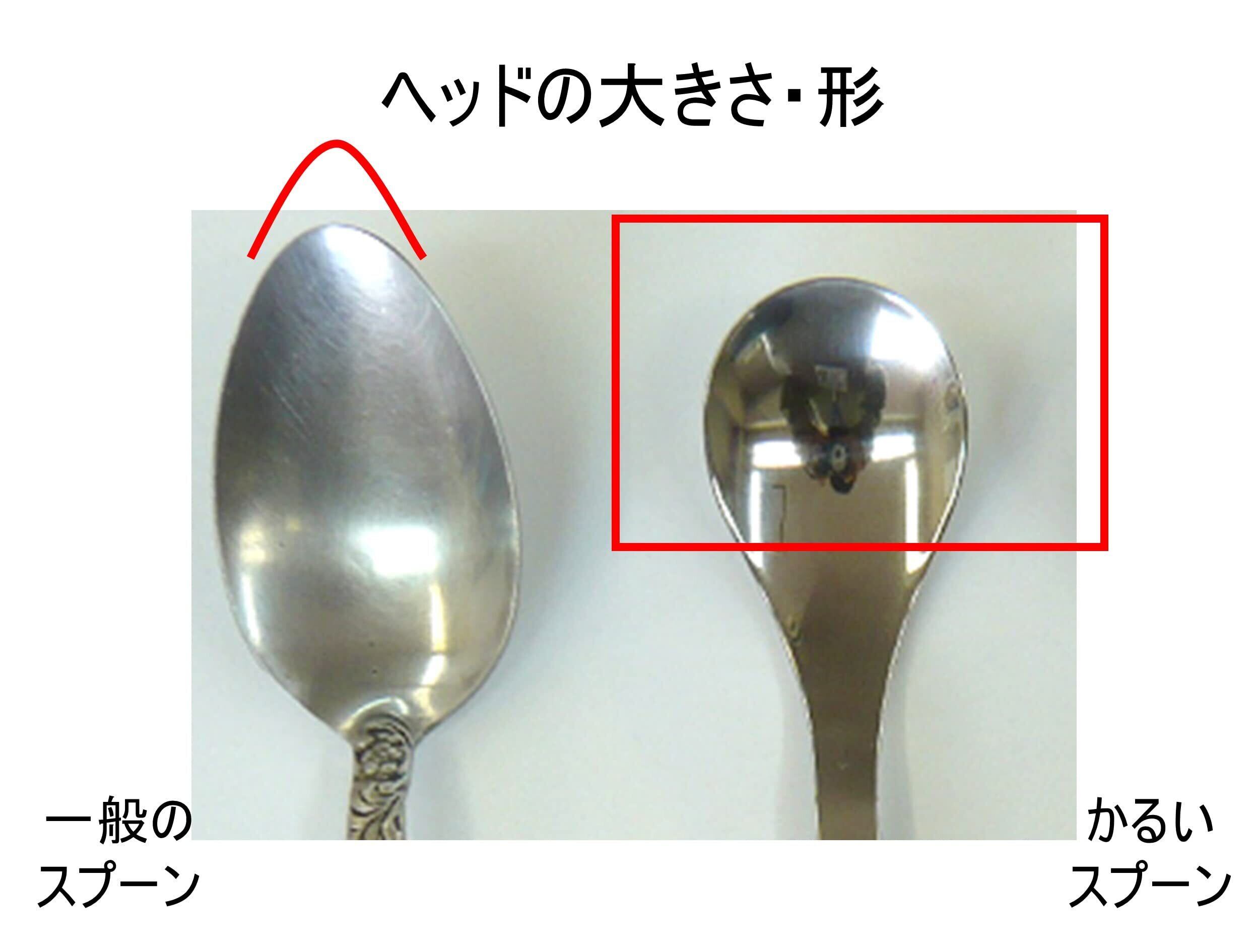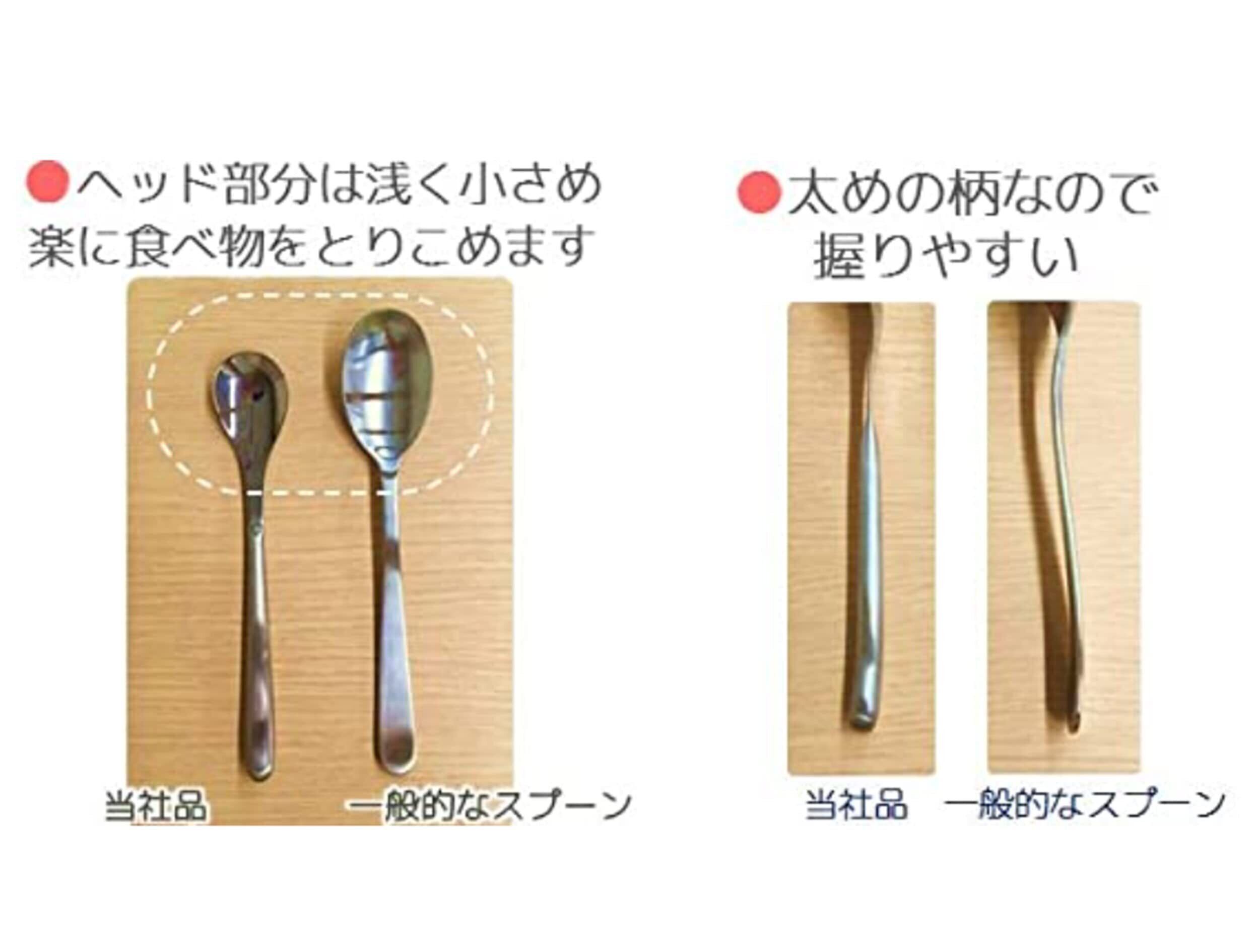 ●ヘッド部が浅く小さめなので、楽に食べ物を摂り込むことができます。先端形状が丸いので、どの方向からも口に摂り込むことができます。