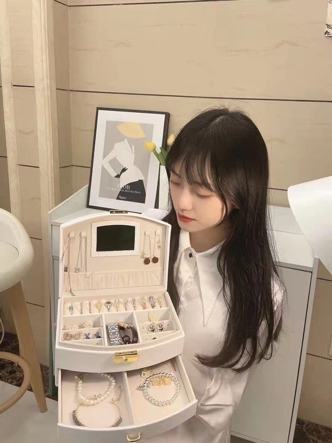 【大容量】宝石箱の寸法:幅20×奥行16×高さ10cm。ジュエリーケーストップ層は指輪、宝石、ネックレス、イヤリング、ピアス、アクサセサリーなどの各種類の小物に合わせるスペースを持っています。これらはこの可愛い収納ケースに入れられます。そして、ピアスに載せるところが自由に開閉できます。下層はブレスレット、腕時計なども収納できます。
