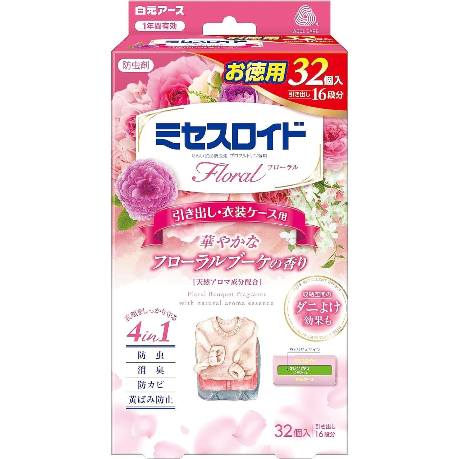 ミセスロイドフローラル 白元アース 衣類防虫剤 引き出し・衣装ケース用32個入 香り付き フローラルブーケの香り 1年間有効 ダニよけ効果付き 虫除け 防カビ 消臭 黄ばみ防止