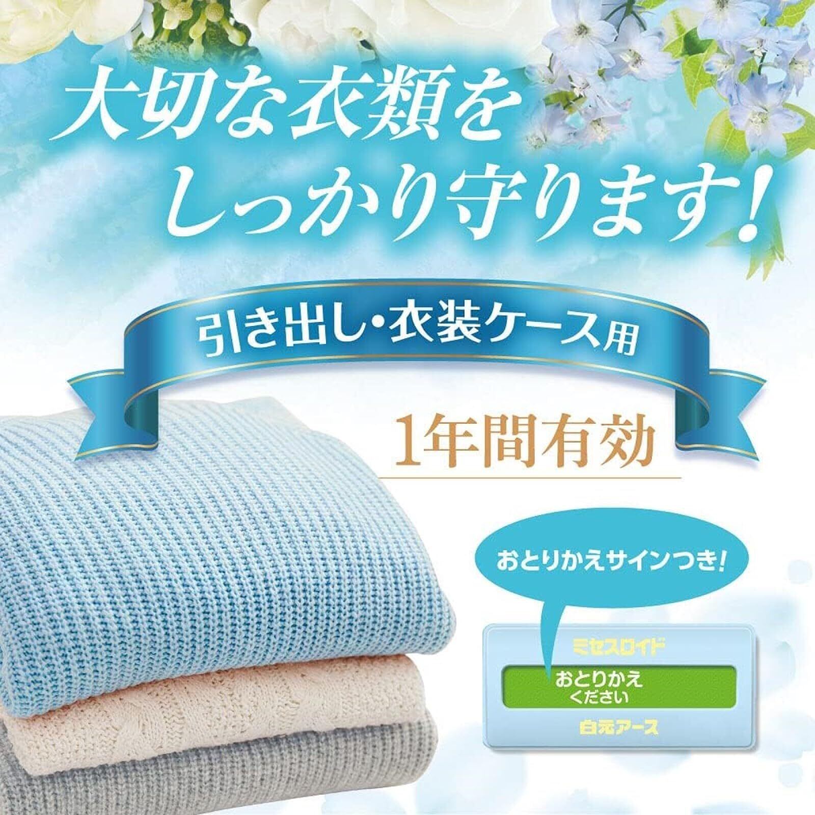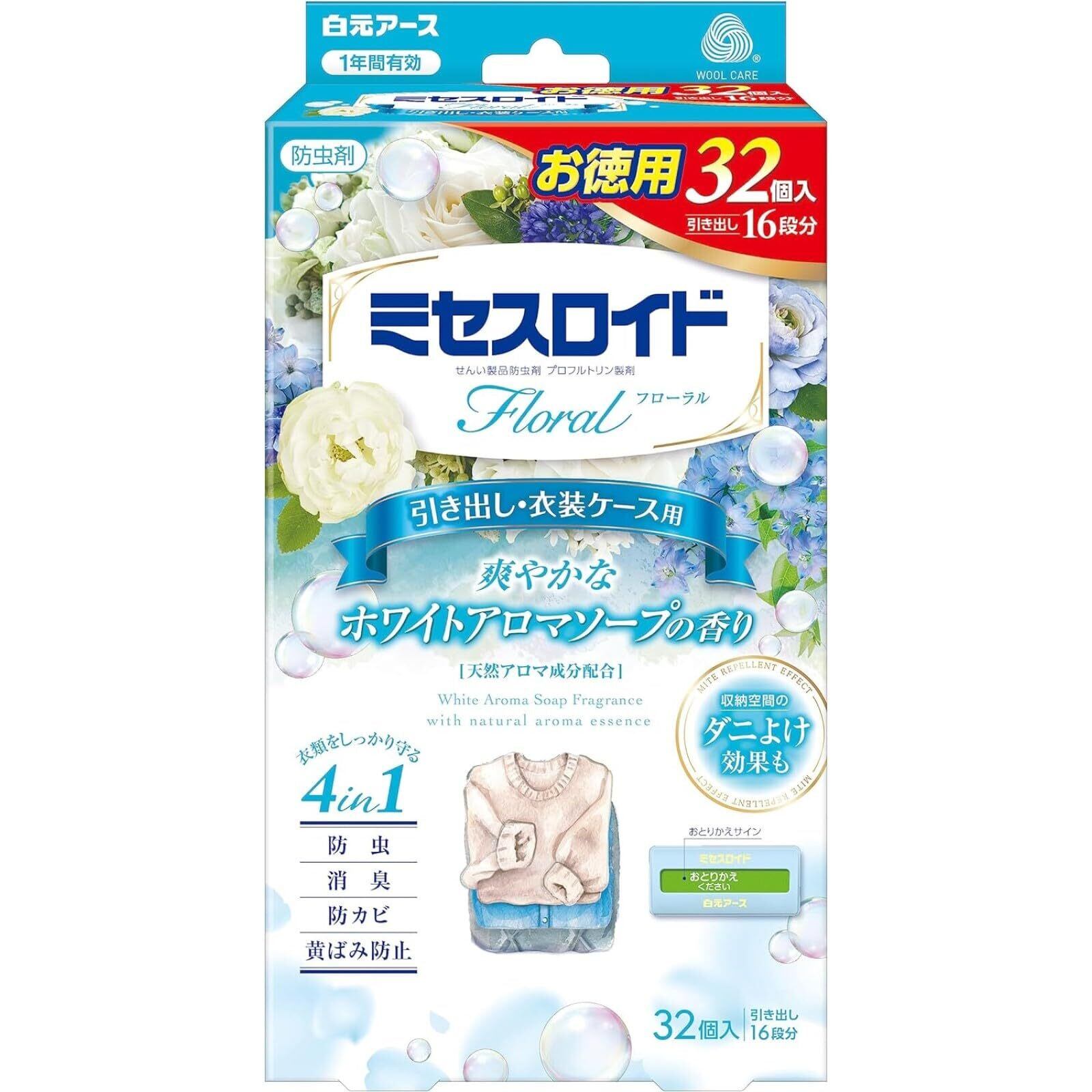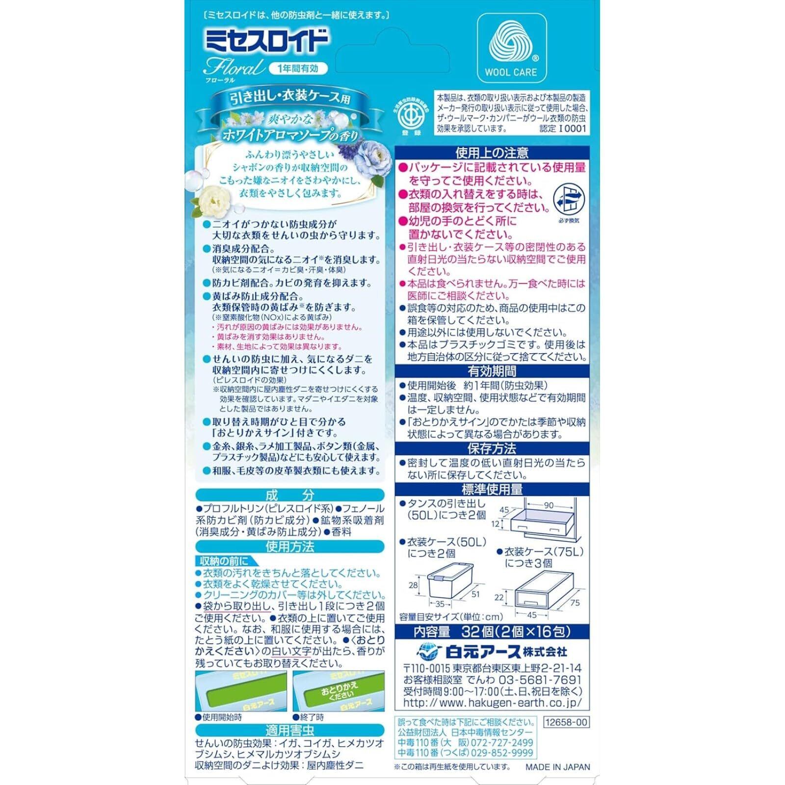 ミセスロイドフローラル 白元アース 衣類防虫剤 引き出し・衣装ケース用32個入 ホワイトアロマソープの香り 1年間有効 ダニよけ効果付き 虫除け 防カビ 消臭 黄ばみ防止