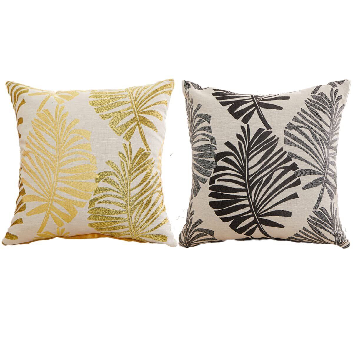 YunJeude クッションカバー 45x45cm 北欧 2枚セット 綿とリネン おしゃれ 可愛い 葉の柄 ジャガード織 ファスナー式 シンプル モダン インテリア (45x45, イエロー&グレー)