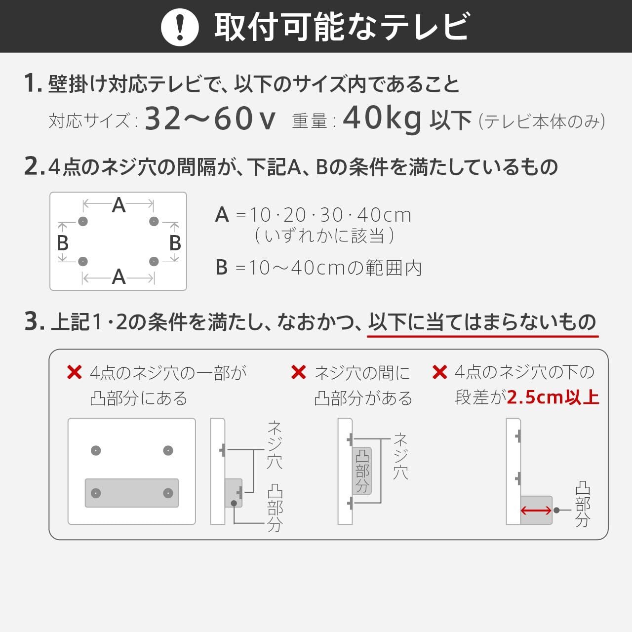【対応テレビサイズ】32~60インチ(40kg相当)まで ※テレビの取り付け可否につきましては、メーカーのホームページ「WALLテレビ対応表」をご覧ください。