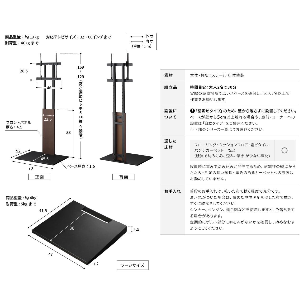 【サイズ】テレビスタンド本体:幅70x奥行52x高さ129~169cm・高さ調節ピッチ:5cm(9段階)・ベース:幅70x奥行52(45.5)cm、厚み15mm・重量:約19kg / 棚板:幅47cm x 奥行41.5cm x 厚み(前/後)20/45mm・重量:約4kg