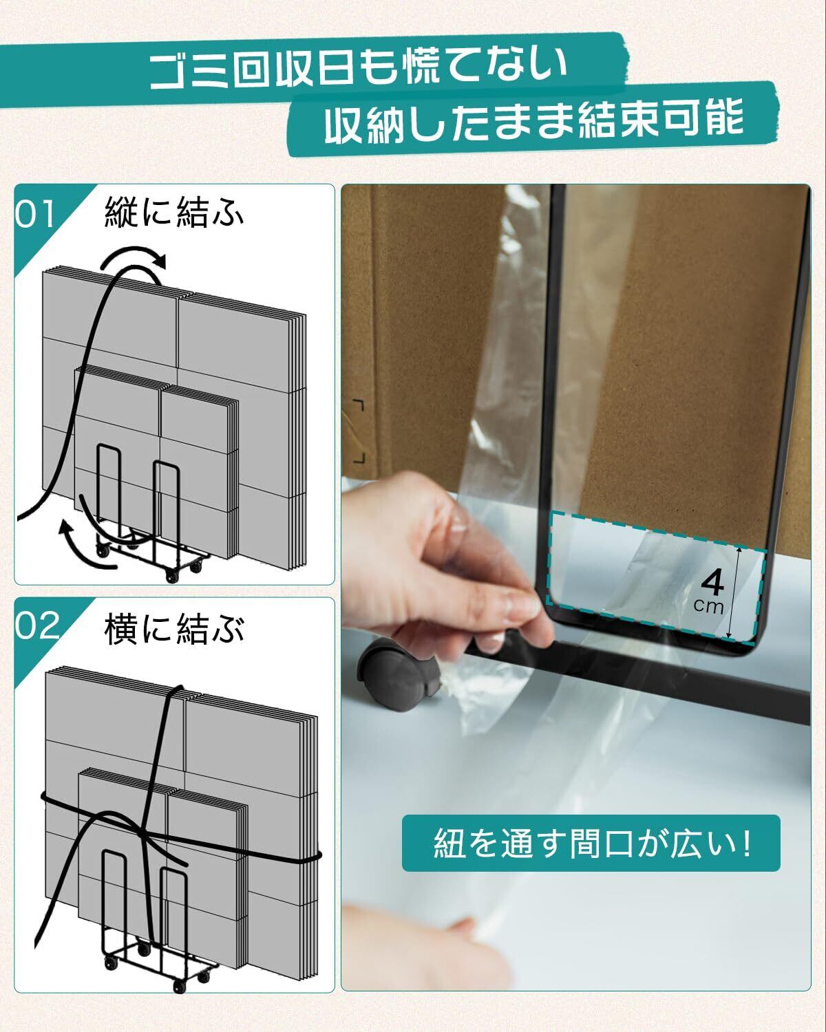 【置いたまま紐を縛れる】収納部分が少し浮いた形状で、中央下の隙間から紐を通すことができるので、収納したままスムーズに束ねられます。また、丈夫なスチール素材に、水や錆に強い粉体塗装で仕上げています。ダンボールの出し入れ時にも傷が付きにくく、ゴミ捨て場など屋外への持ち運びも可能です。
