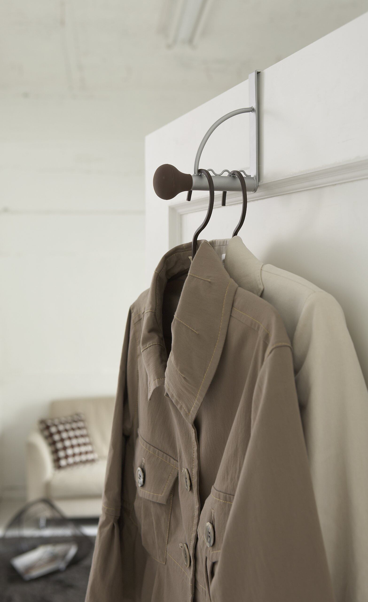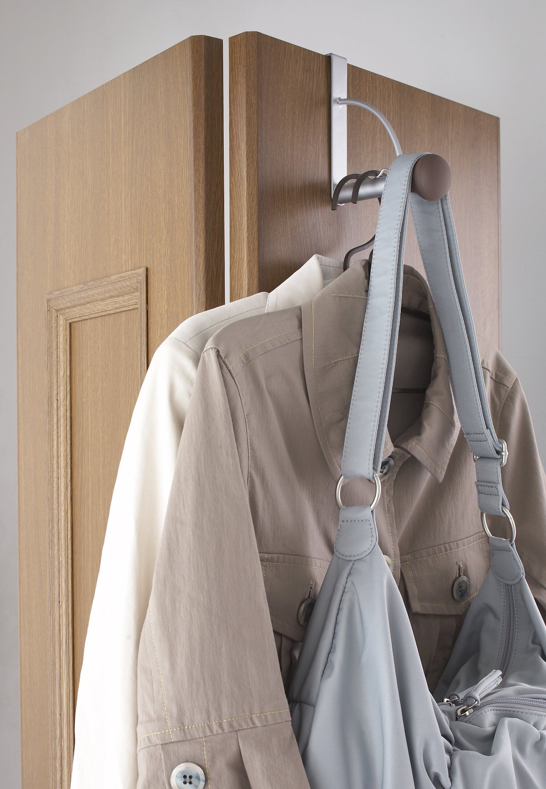 ドアや折れ戸に簡単・便利なドアハンガー。滑りにくいシリコン素材になっているので洋服をそのまま掛けられます。帽子やバッグなどを掛けてもOK