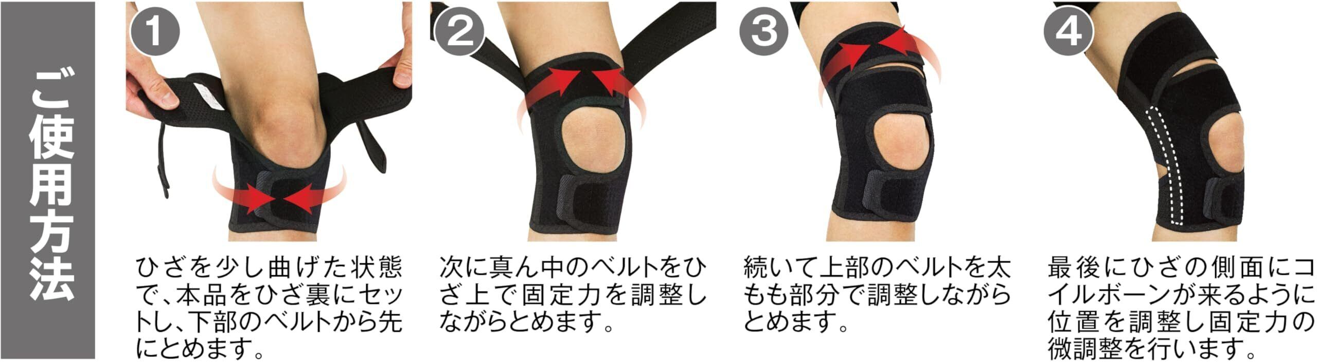 サポーターのズレを防ぐ「太もも加圧ベルト」。ねじれの力で安定させる「ひざ加圧ベルト」。大腿部を「太もも加圧ベルト」で加圧・固定することでサポーターのズレを抑え、安定性・固定性を向上させるとともに「ねじれの力」で安定させる「ひざ加圧ベルト」を締めることで左右のグラつきを抑え両サイドに配置したコイルボーンがしっかりと動きを制御します。