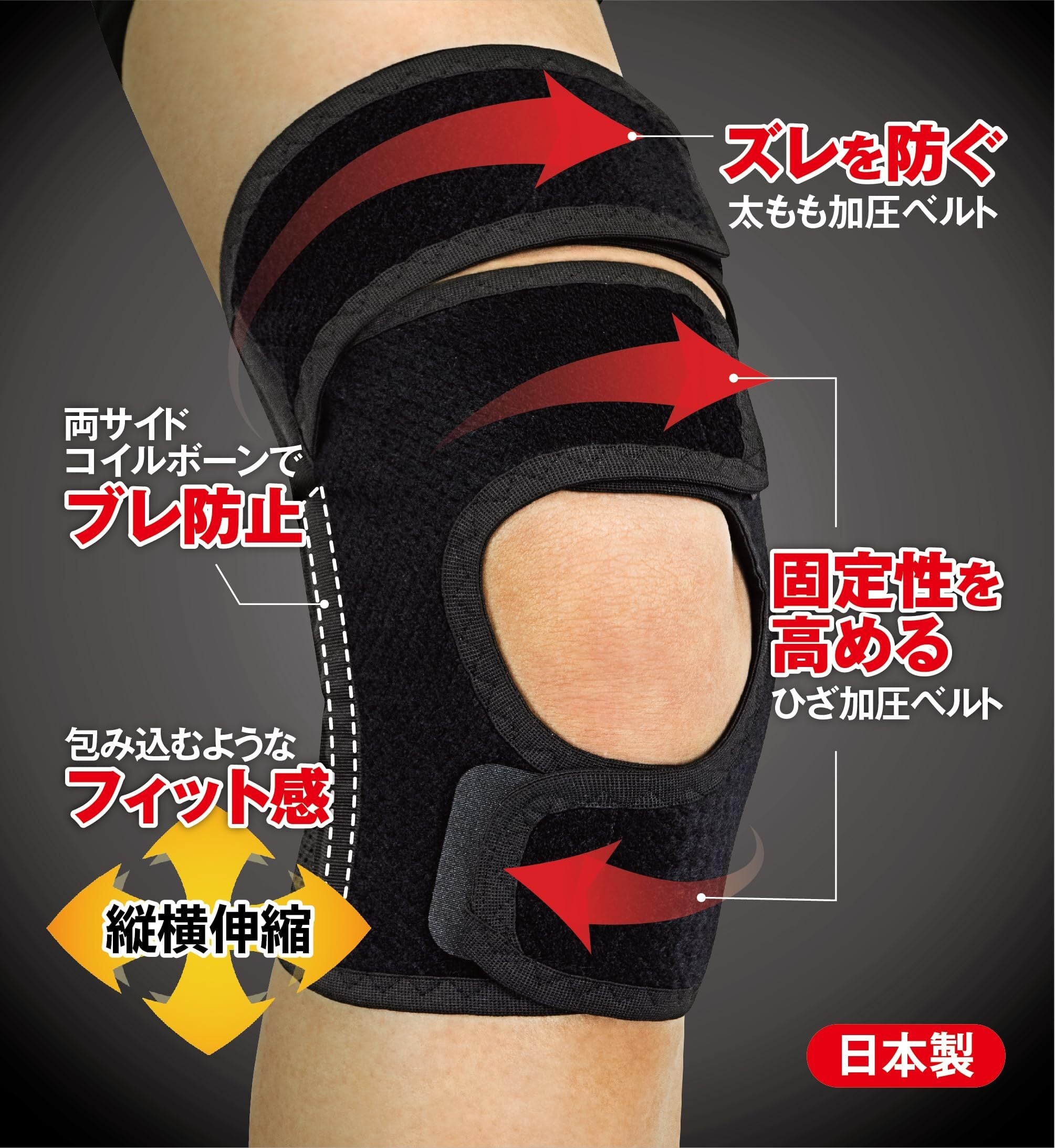 伸縮性の高い太もも加圧ベルトが膝を曲げたときのホールド性を上げ、サポーターの安定感とズレ抑制に繋がります。また、左右のコイルボーンにより、膝関節のグラつきと内外反の動きも制御され、左右・前後の固定力が高まります。