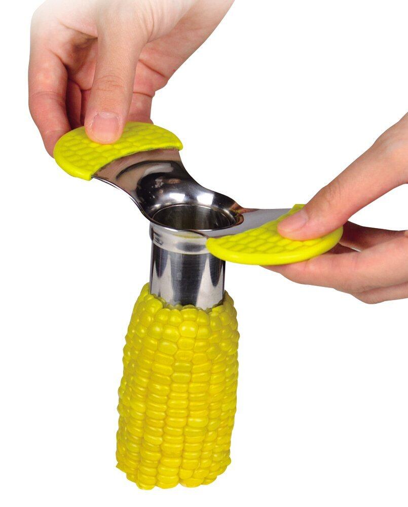 とうもろこしにコーンカッターを当て、下に押し下げると簡単に実をそぎ落とせる