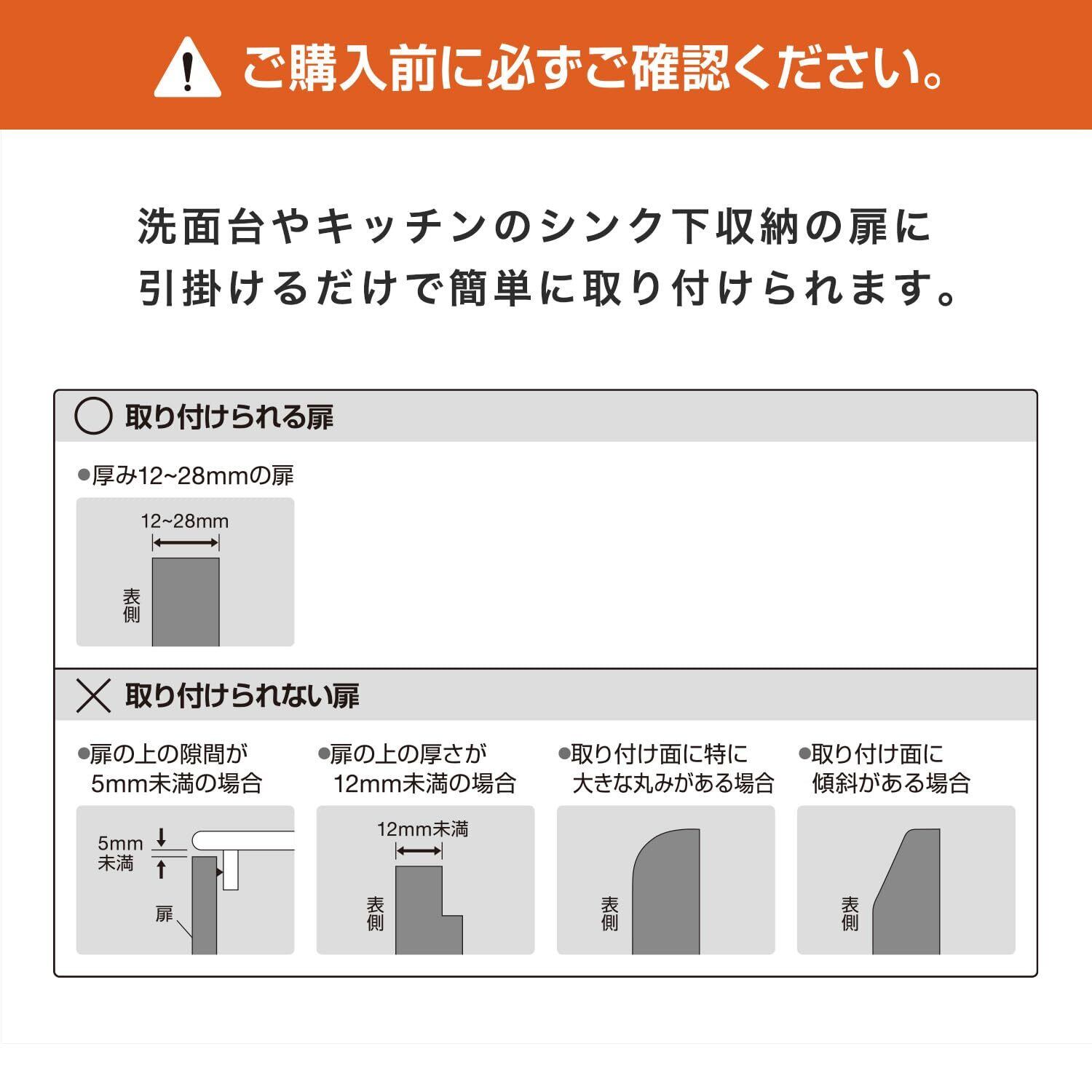 洗面台やトイレの扉、シンク下の扉などに引掛けるだけで取り付けられます。