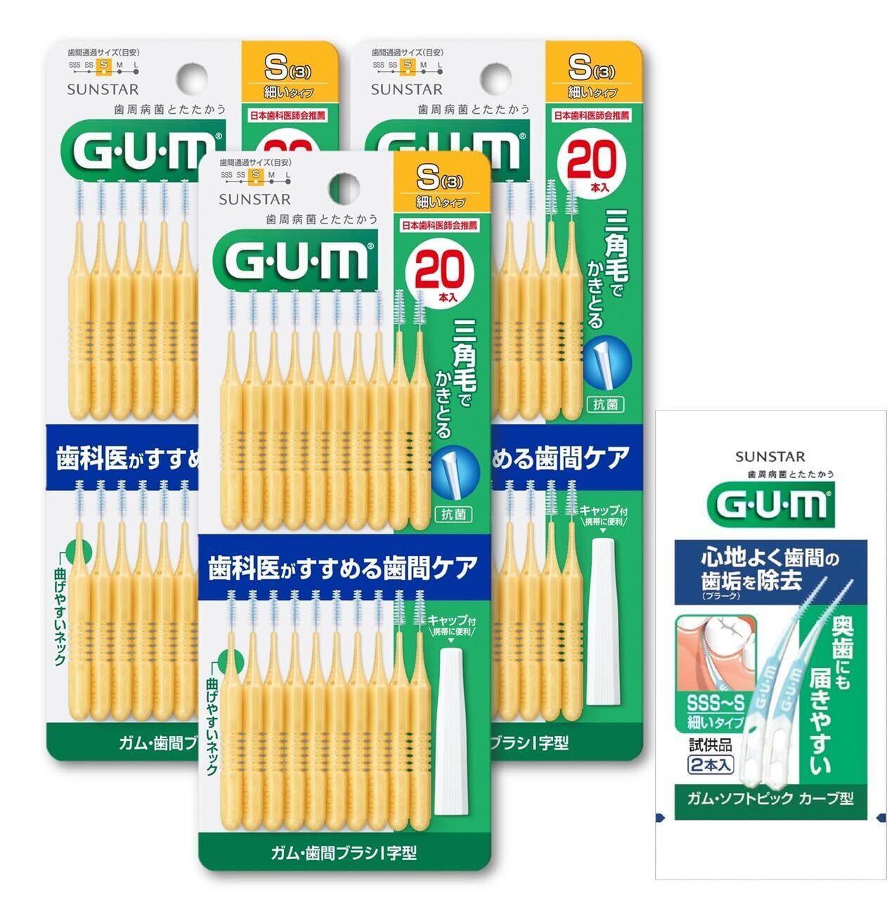 GUM(ガム) 歯間ブラシ I字型 ワイヤータイプ [サイズ:S (3)] 20本入×3個パック+おまけ付き