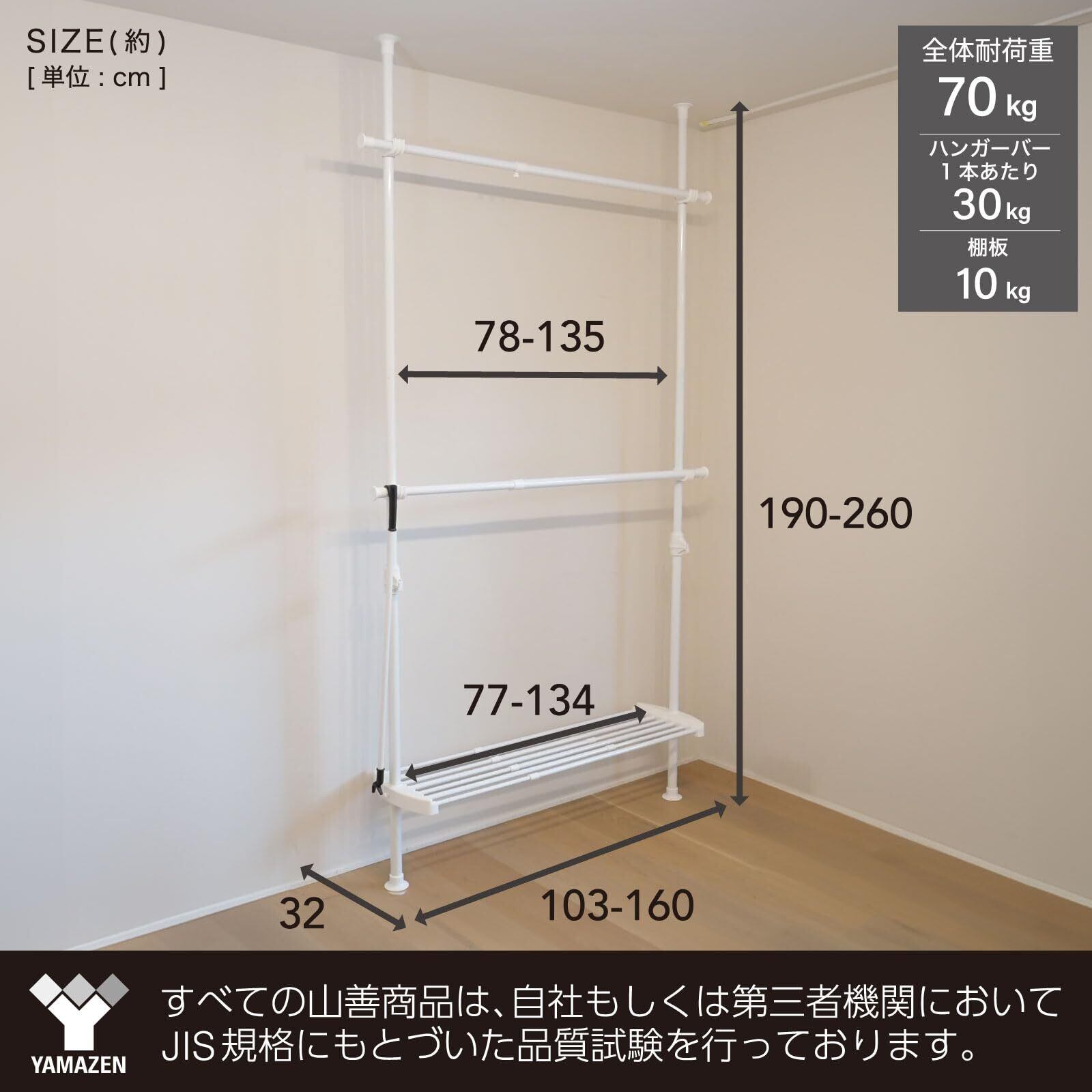 ●本体サイズ:幅103-160×奥行32×高さ190-260cm●耐荷重 : 全体70kg(ハンガーバー1本あたり : 約30kg、平棚1段あたり : 約10kg)●構造部材 : 金属(スチール)、ポリプロピレン、ABS樹脂●表面加工 : エポキシ樹脂塗装●東証プライム(株)山善で扱うすべての山善商品は、自社もしくは第三者機関において、JIS規格に基づいた品質試験を行っております。