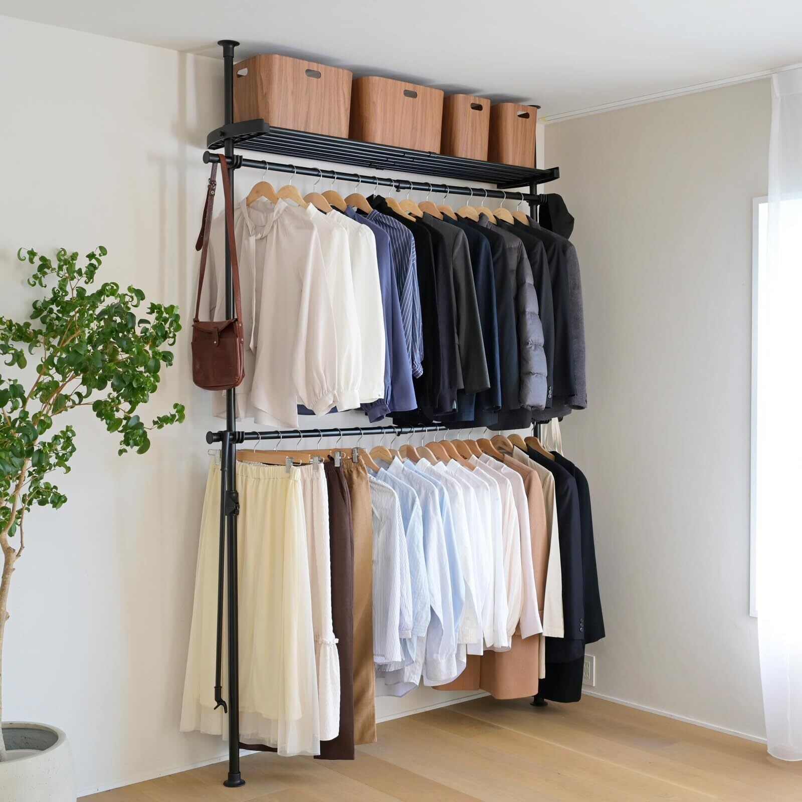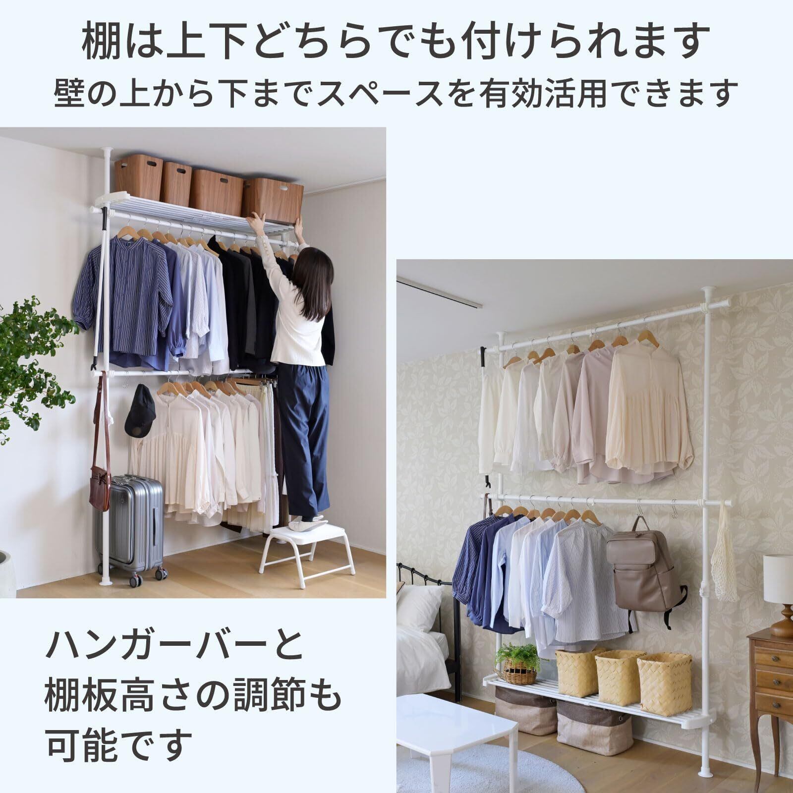 【タテのスペースを有効活用】突っ張って設置するので場所をとらず、天井近くのデッドスペースまでタテの空間を有効活用できるハンガーラックです。伸縮棚はハンガーバーの上段もしくは最下段どちらにも取り付け可能でお好みで選べます。