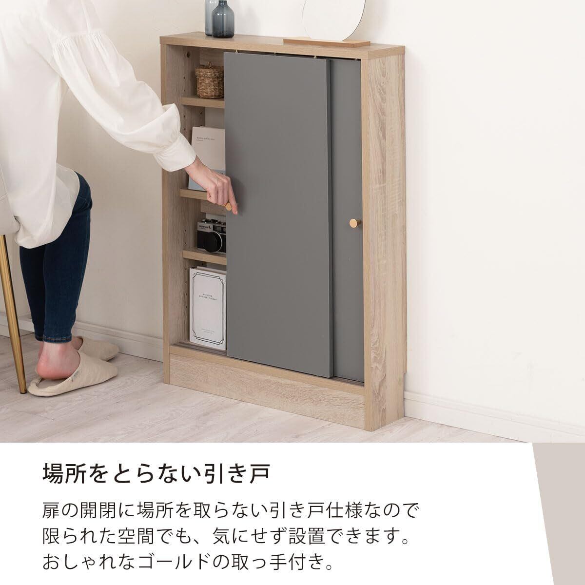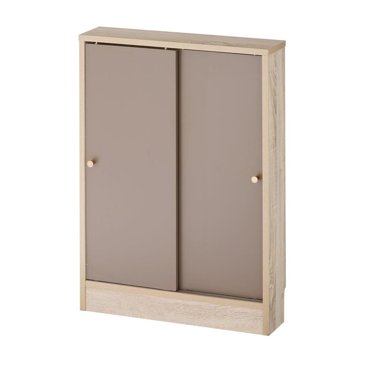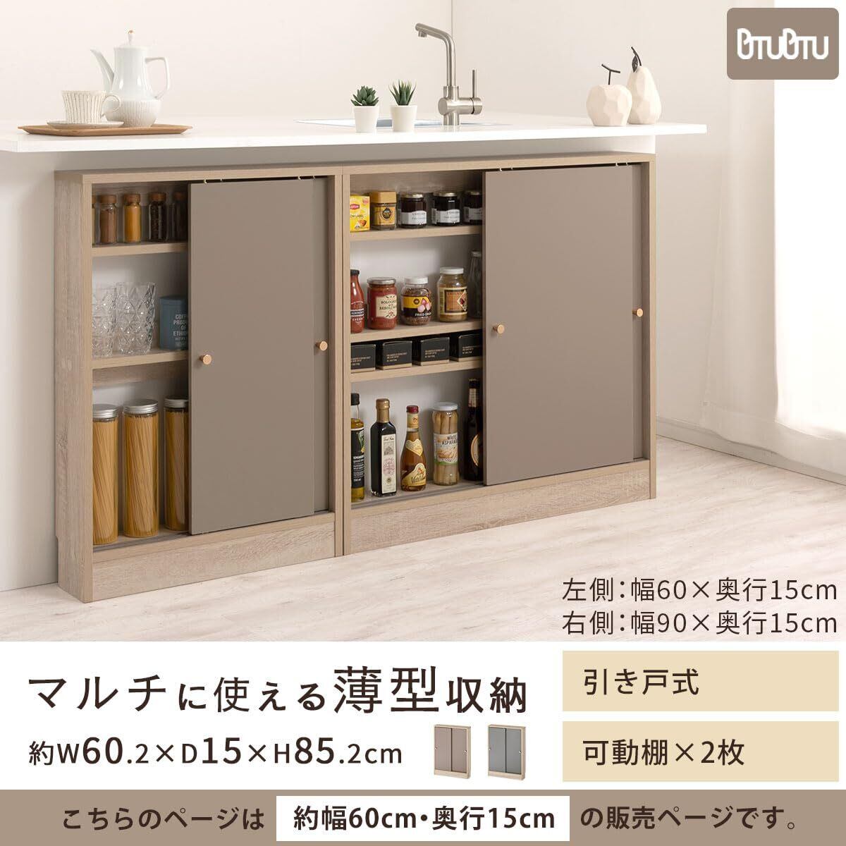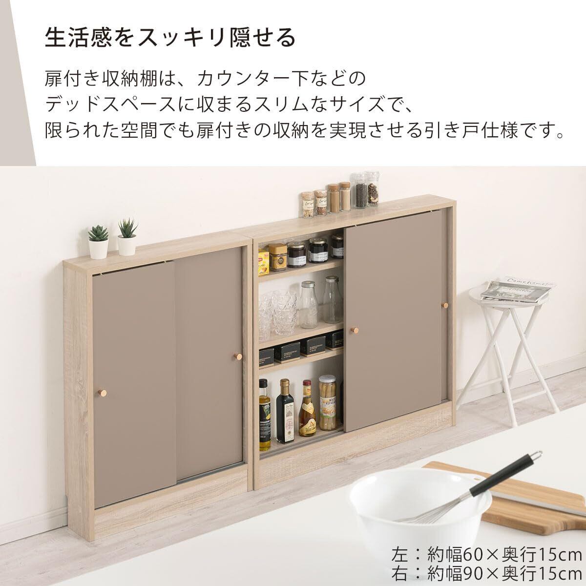 ぼん家具 カウンター下収納 奥行15cm 引き戸 幅60cm 薄型 キッチン収納 マルチラック キャビネット グレージュ