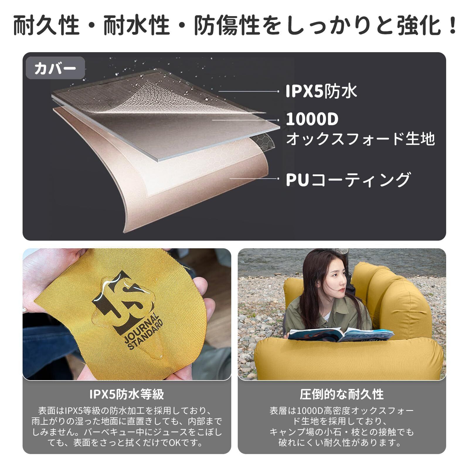 【圧倒的な耐久性と防水性】このエアーソファーは1000D高密度オックスフォード生地を採用しており、キャンプ場の小石・枝・金属チェアとの接触でも破れにくい耐久性があります。また、IPX5防水等級で、雨上がりの湿った地面に直置きしても、内部までしみません。バーベキュー中にジュースをこぼしても、表面をさっと拭くだけでOK。