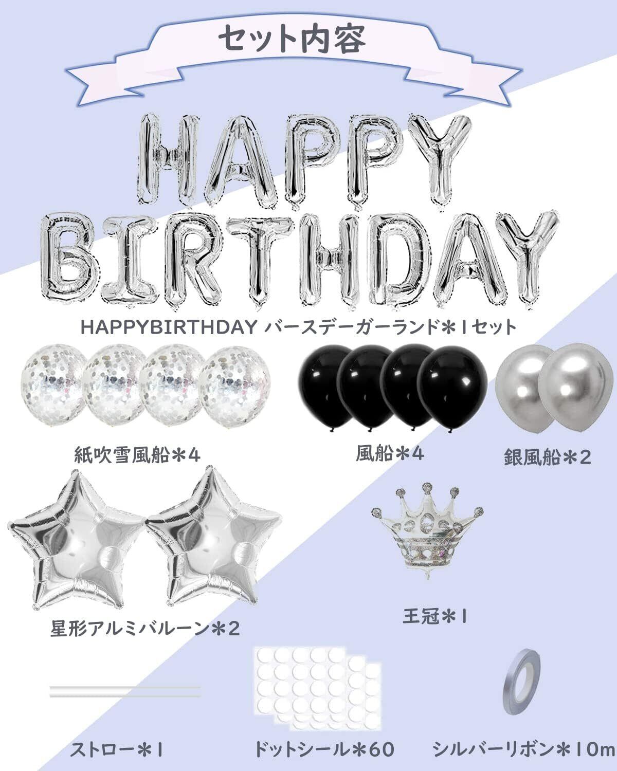 輝くセット:誕生日バルーンセット内容:シルバー紙吹雪バルーン×4個、シルバーバルーン×2個、ブラックバルーン×4個、Happy Birthday風船各文字×1個、スターバルーン×2個、王冠バルーン×1個、ドットシール×2個、シルバーリボン×10 m、吸込管×1本