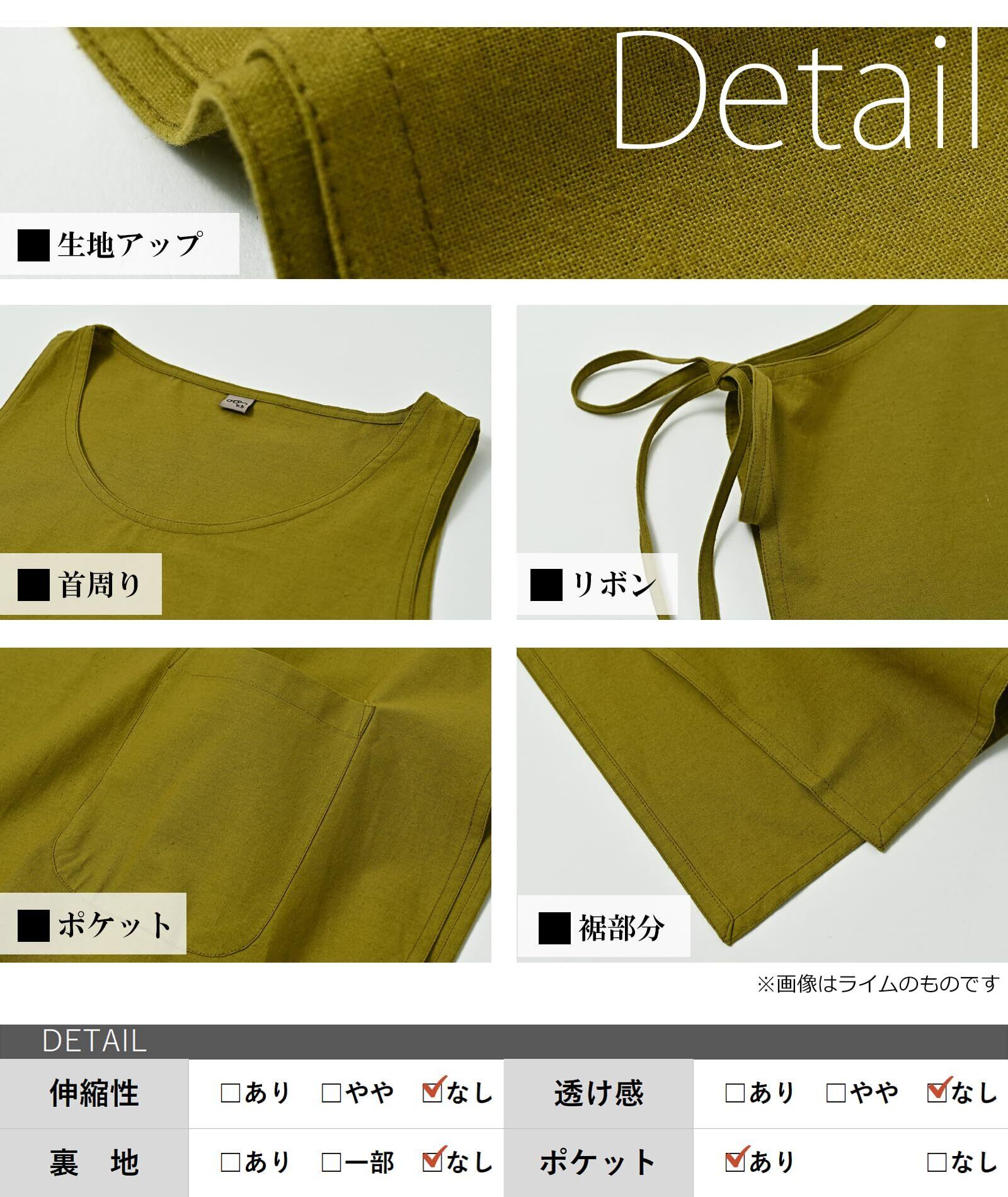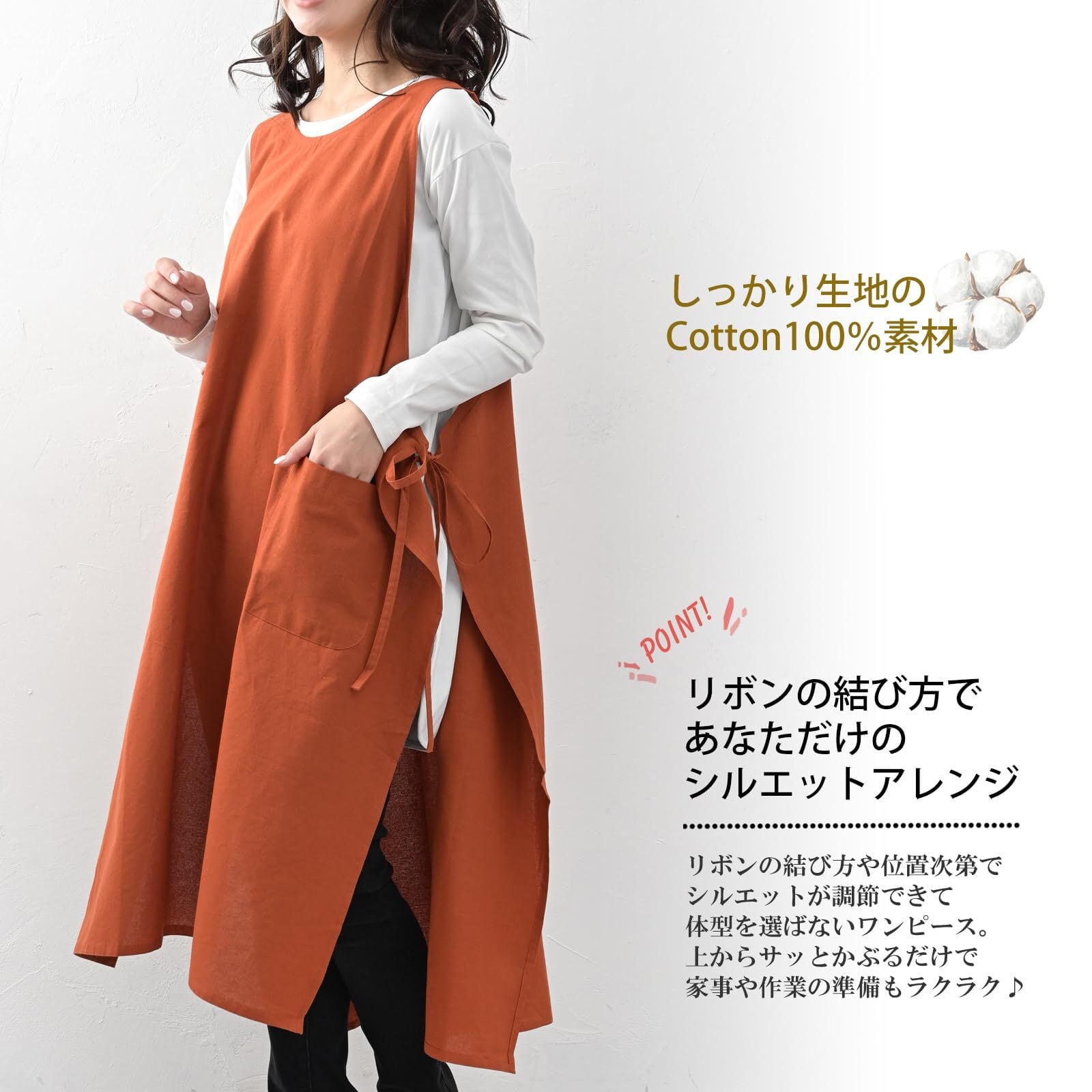 【ポイント】ラウンドネックで広く開いた胸元が魅力のデザインは、ストンとかぶりやすく、大きめポケット付き。サイドリボンでシルエット調節が可能で、程よいミドル丈がスタイルアップを叶えます。ボトムスとも馴染みやすく、しっかりとした「Cotton100%素材」で快適な着心地です。シンプルながら機能性抜群の一枚です。