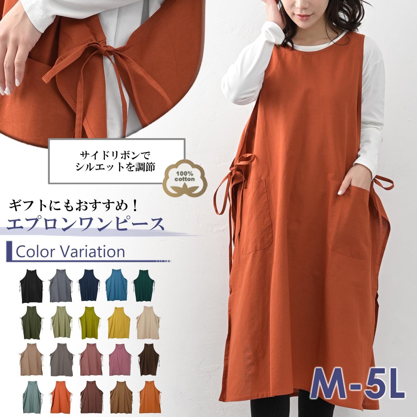 カラバリ豊富でギフトにもお勧め!綿100%エプロンワンピース。スポッと着るだけで抜け感のあるスタイルに。サイドリボンの結び方を変えるだけでスッキリシルエットに変身できます。ワンピース フリーサイズ コットン 柄プリント 無地 春 夏 秋 黒 緑 橙 紫 紺 黄 青 M L LL 3L 4L 5L 9号 11号 13号 15号 17号 19号 hb-ss-op2623