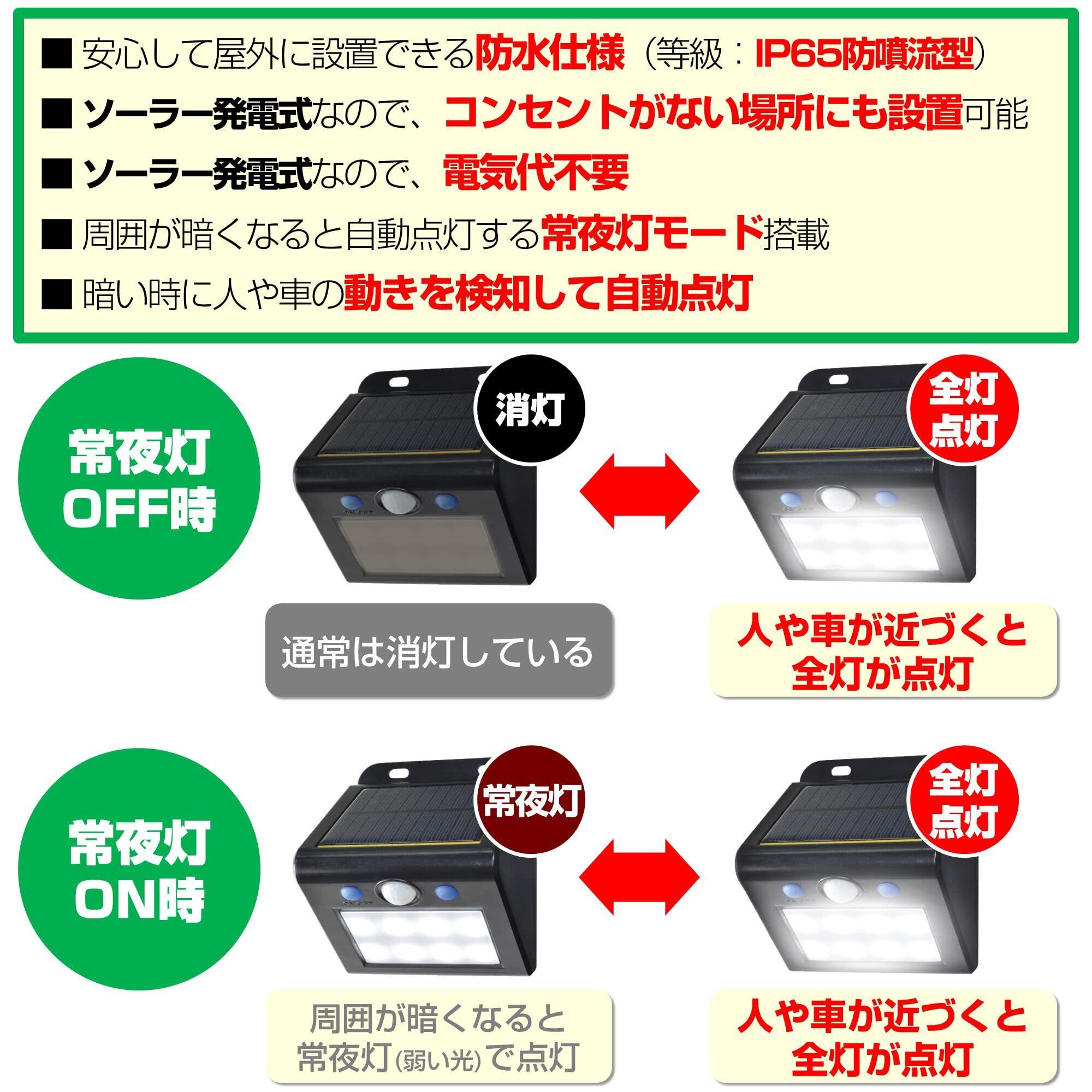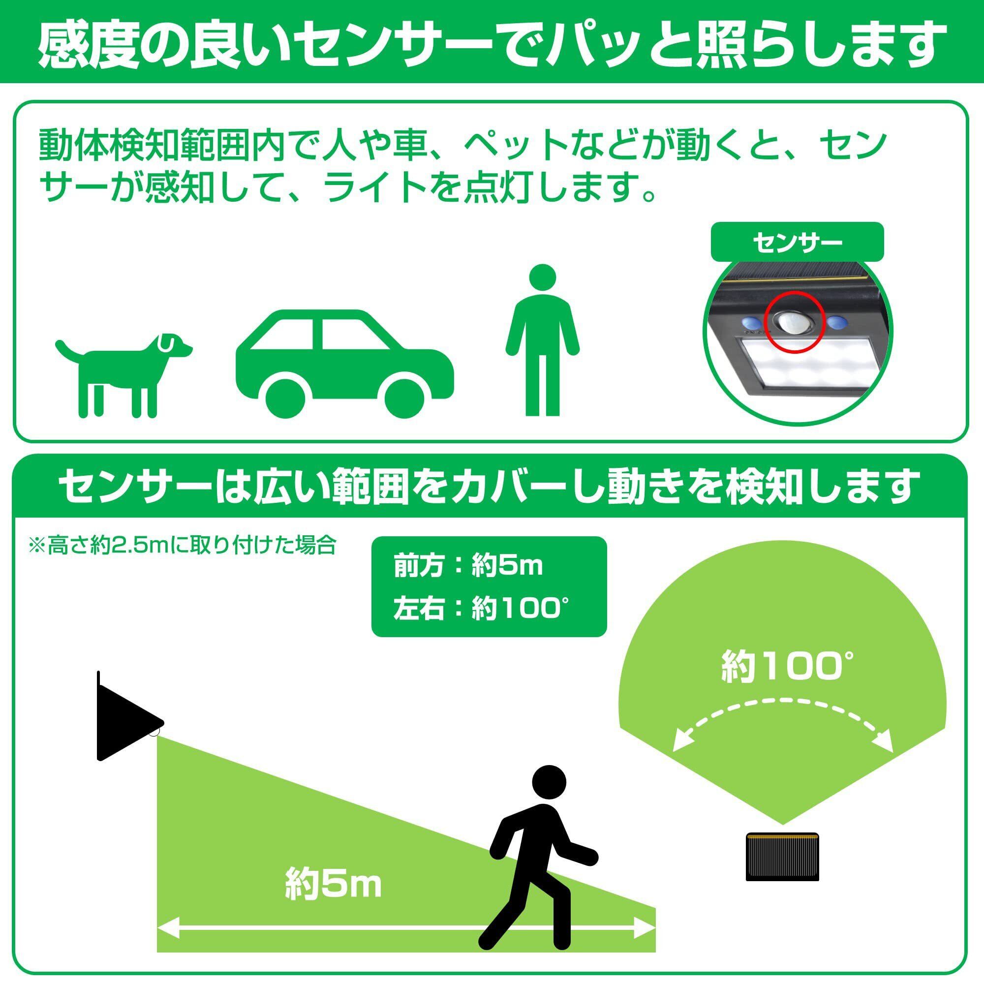 【広範囲に周囲を照らす】検知範囲は広範囲な前方約5m、左右約100°。周囲が暗くなると自動で点灯する常夜灯モード搭載(ON/OFF切替可能)です。