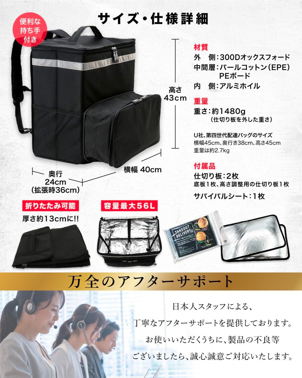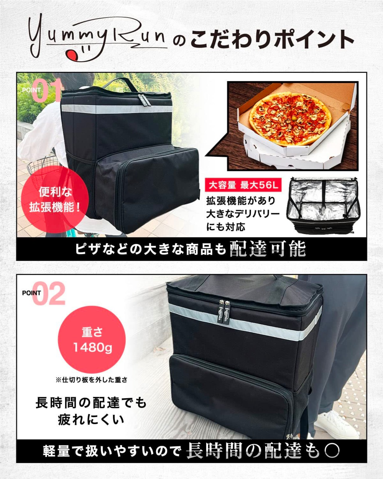 ️【最大56Lの大容量設計】ピザやお寿司など大きなデリバリーの配達にも対応できるように拡張できる配達バッグ!
