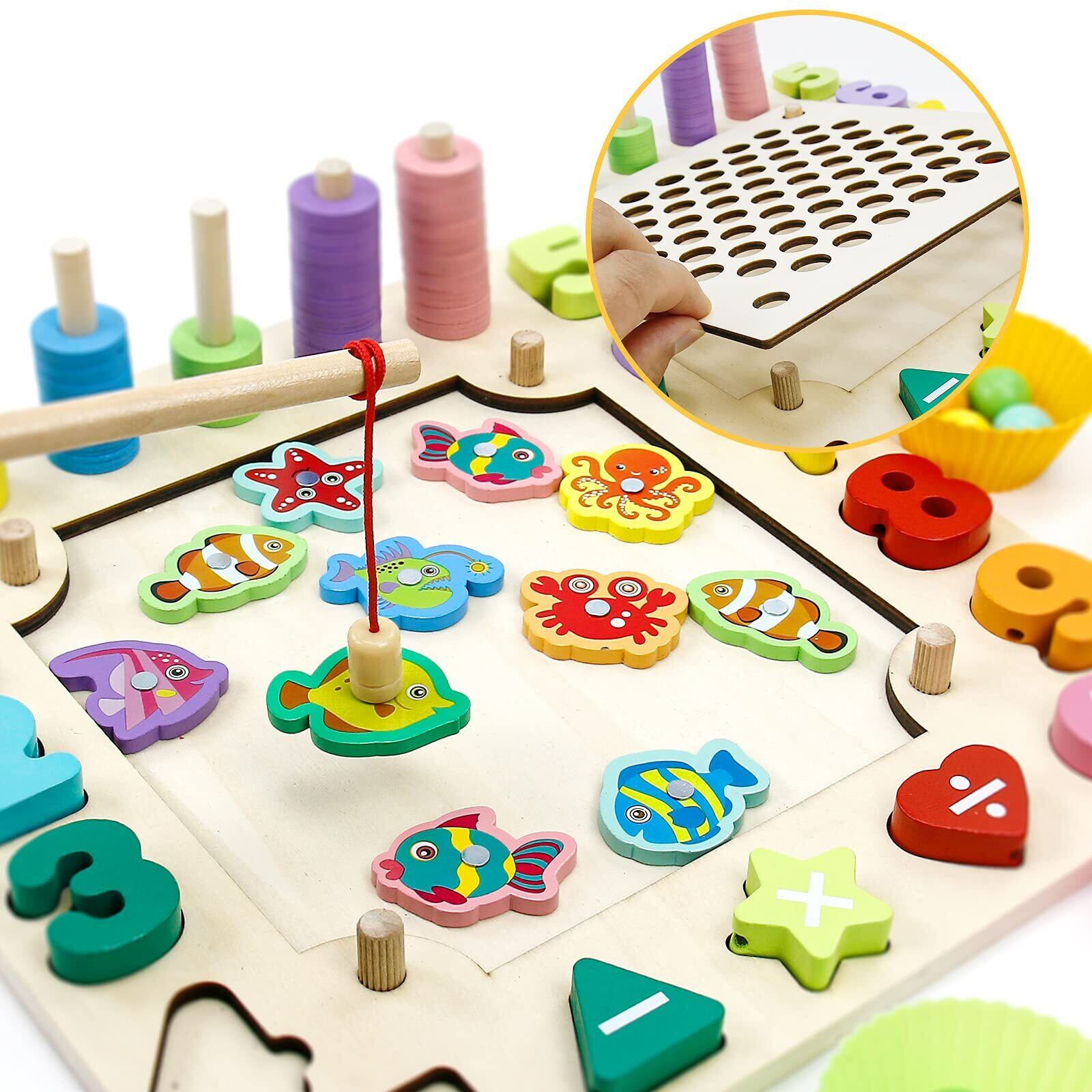 【多彩なプレー】 木製の多機能知育玩具には、ブロックで遊びながら、0〜9の数字を学べます。サークルスティックゲームでは、簡単な足し算と引き算を練習できます。木製の小さな魚や海の生き物のマグネットピースで、お子さまはマグネット釣り竿を使って釣りを楽しむことができます。カードを対応させ、同じ色の玉を木のトレーの同じ位置に置き、箸やスプーンを使って同じ色の玉を同じ色のカップに入れることで、お子様の集中力を高めます。向き知育玩具 2 3 4 5 6 歳。