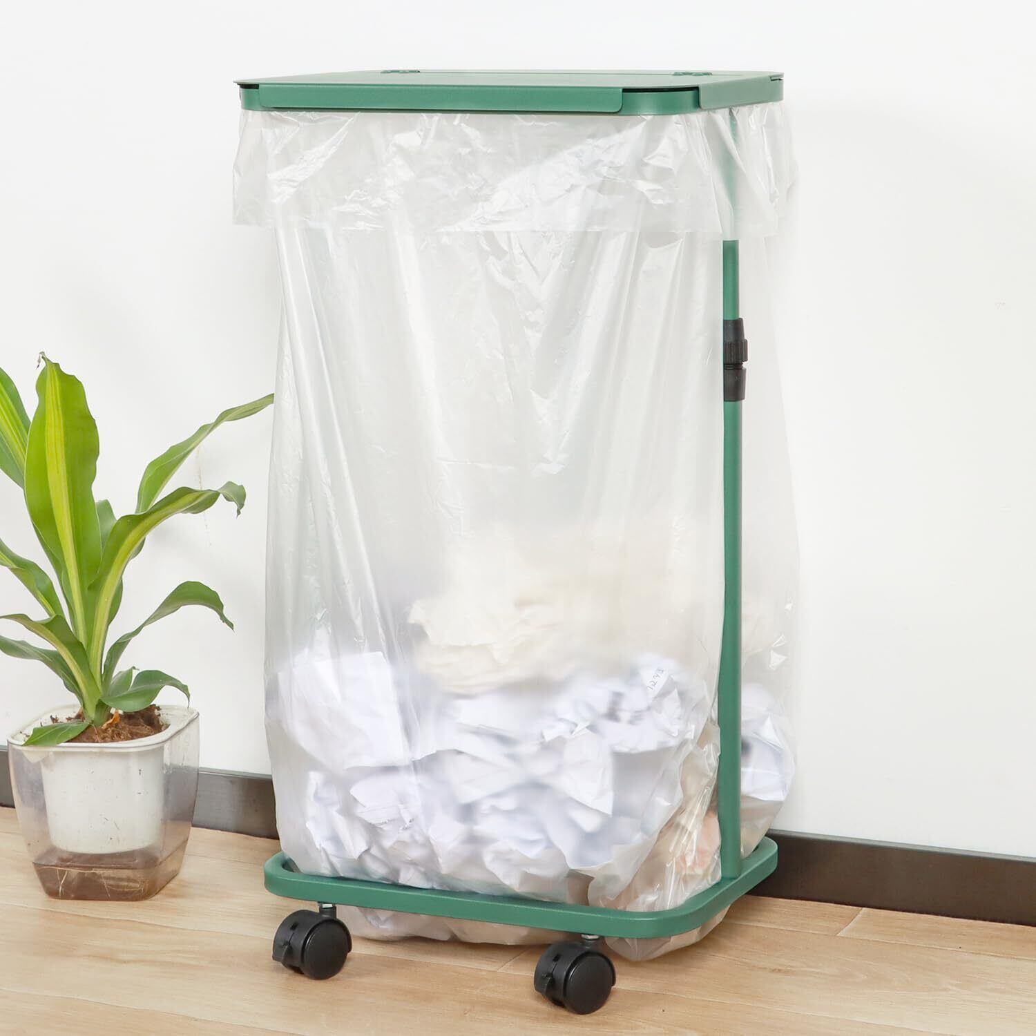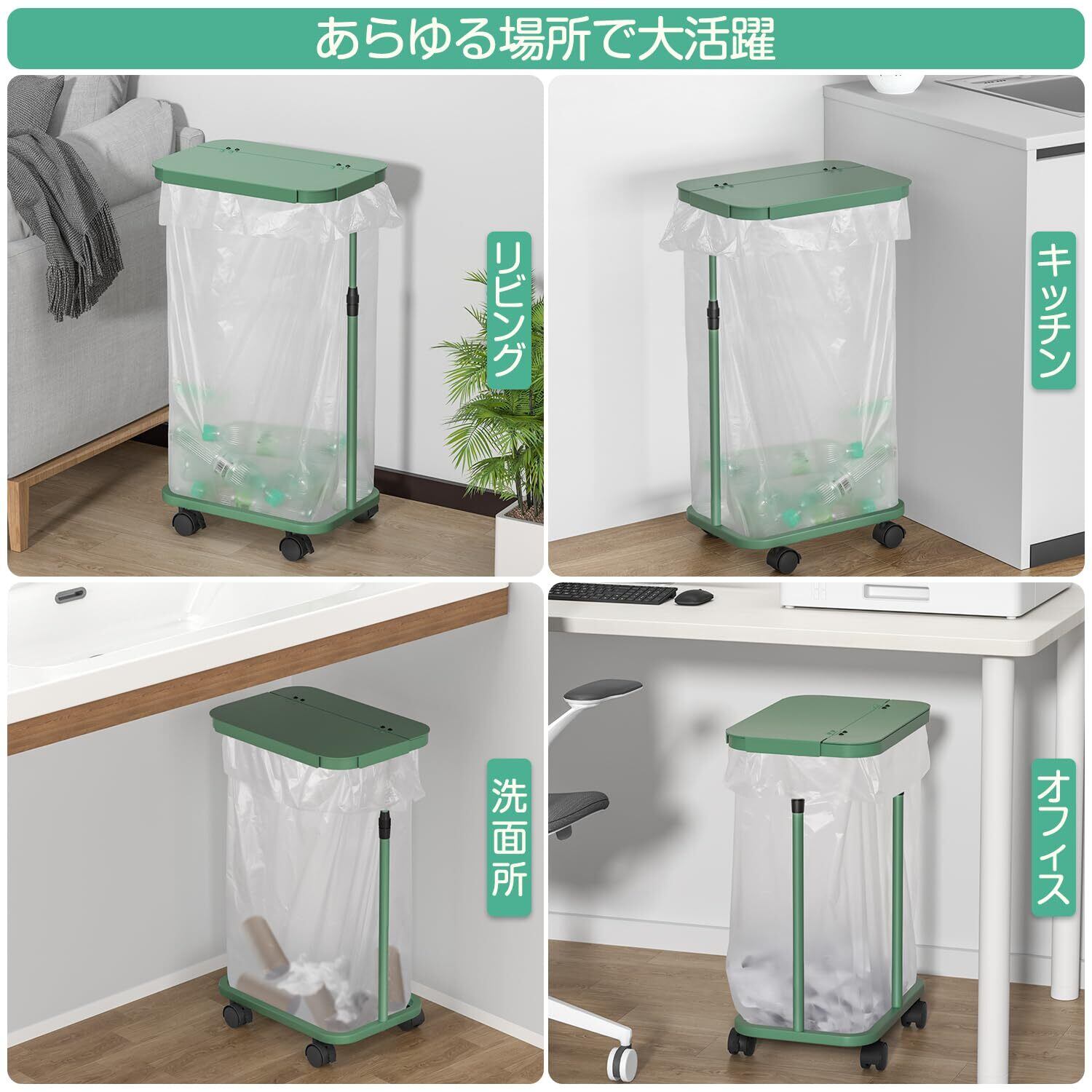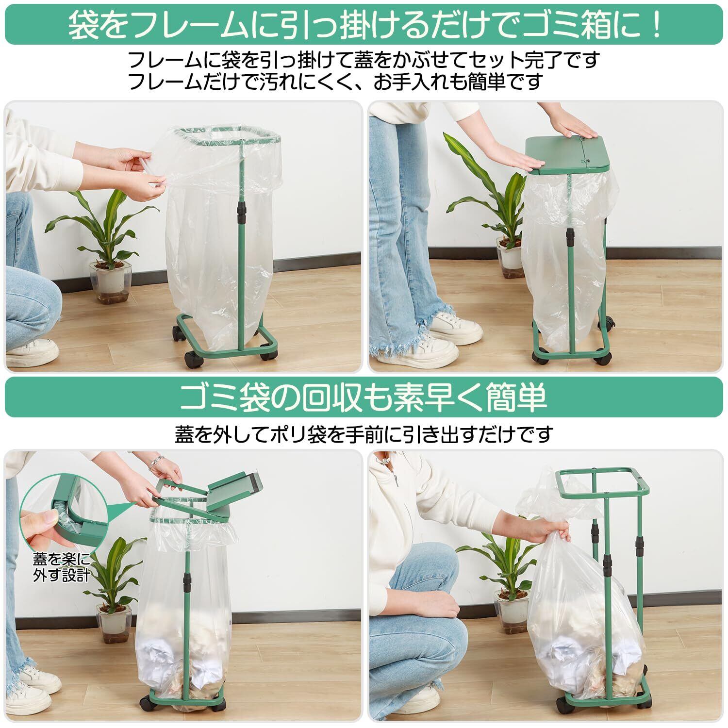 ゴミ袋ホルダー 横開き ゴミ箱 45l 高さ調整可 20L~90L袋対応 分別ゴミ箱 スリム キャスター付き ゴミ袋 スタンド ポリ袋ホルダー 蓋付き おしゃれ 簡易 ワイドな開口部 ニオイ漏れ対策 キッチン オフィス 台所 リビング 洗面所 トイレ 塵袋ホルダー レジ袋スタンド (グリーン)