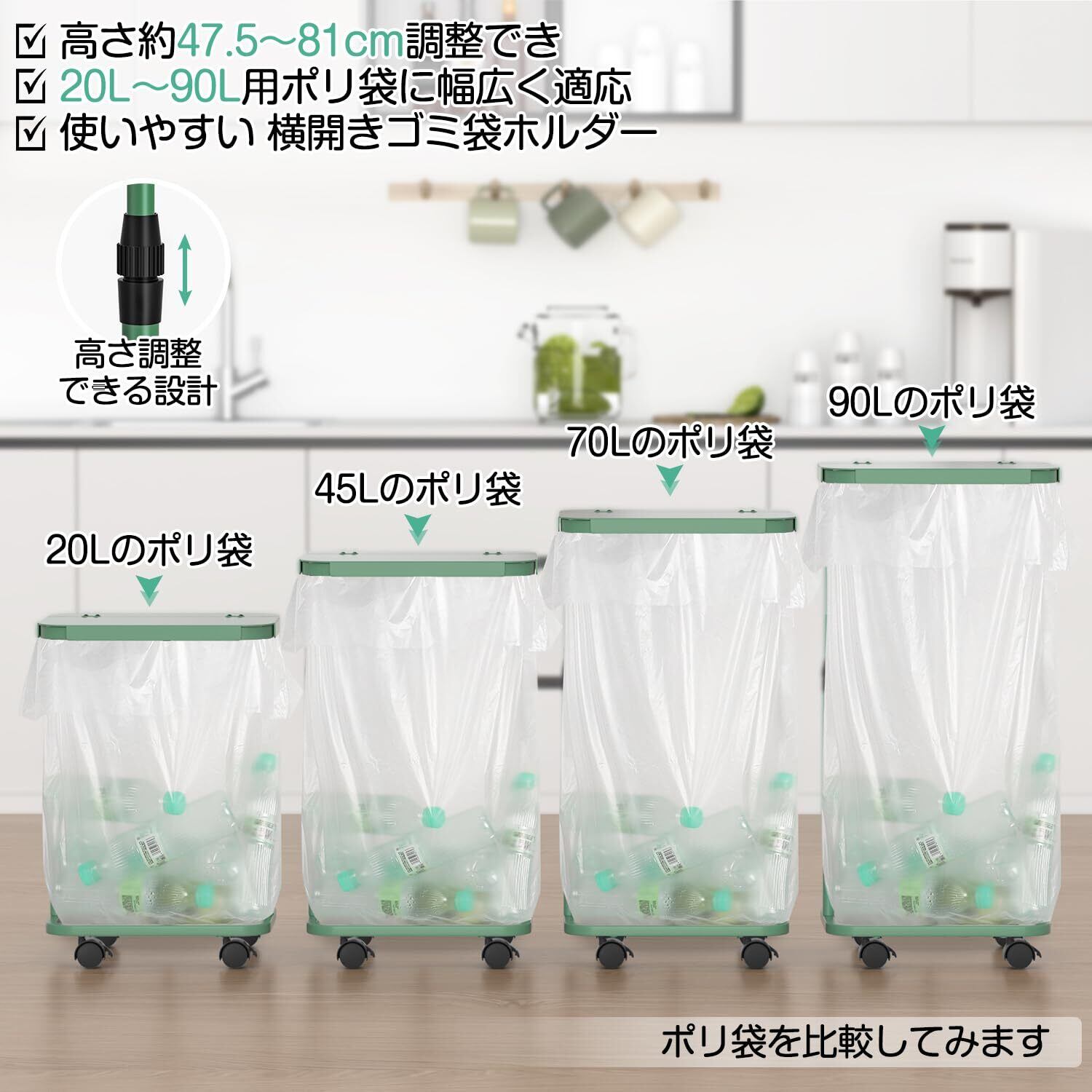 【20L~90L袋対応】高さは約47.5~81cm調整できるゴミ袋ホルダーです。高さの調整だけで20L、30L、45L、70L、90L袋などに幅広く対応する上、スペースを取らないことも保証されます。容量が決められたゴミ箱と違って、ゴミ袋の大きさに合わせてゴミをよりいっぱい入れることができますので、ゴミ捨ての日までに何度も袋を替える必要がない上、一人暮らし 便利グッズとしてはもちろん、家庭用ゴミ箱としても最適です。