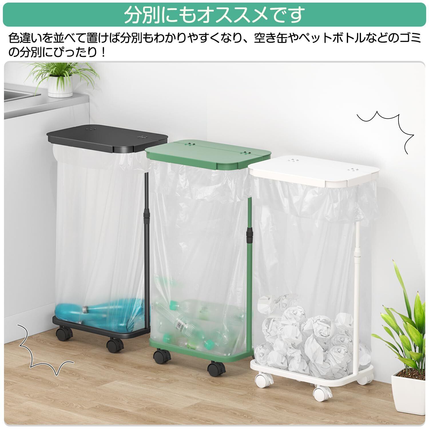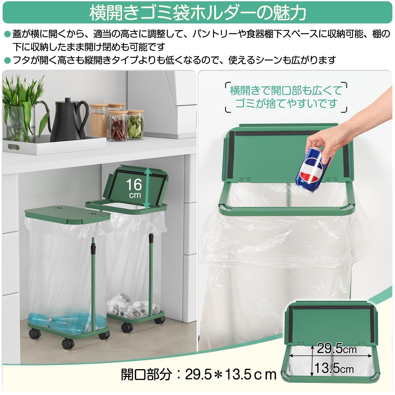 【横開きタイプ&使用簡単】蓋が横に開くから、適当の高さに調整して、パントリーや食器棚下スペースに収納可能、棚の下に収納したまま開け閉めも可能な横開きゴミ袋ホルダーです。フタが開く高さも縦開きタイプよりも低くなるので、使えるシーンも広がります。️また、ゴミ袋をフレームに引っかけて簡単にゴミ箱として使用できる上、開口部も広くてゴミが捨てやすくて、ゴミがパンパンに溜まっても、大きく開いた側面からゴミ袋を取り出せるのでゴミ出しも容易にできます。简单に使用できるキャスター付きゴミ袋ホルダーです。