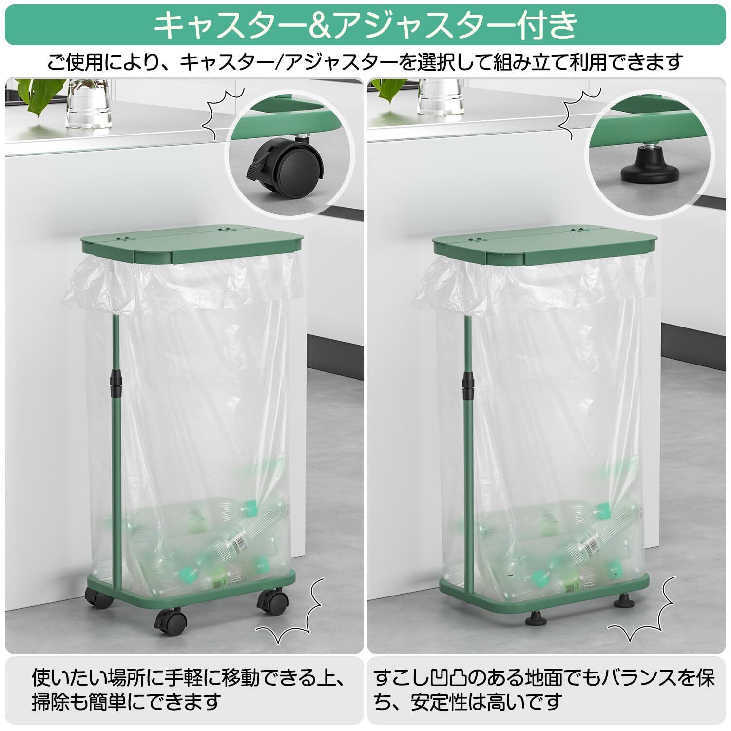 【キャスター&アジャスター付き】ご使用により、キャスター/アジャスターを選択して組み立て利用できる45Lゴミ箱です。キャスターを選択する場合、サッと移動しやすくて使い勝手がよく、普段の掃除も簡単にできます。またストッパーつきキャスターですので固定もできて便利です。️アジャスターを選択する場合、すこし凹凸のある地面でもバランスを保ち、安定性は高いスリムゴミ箱です。
